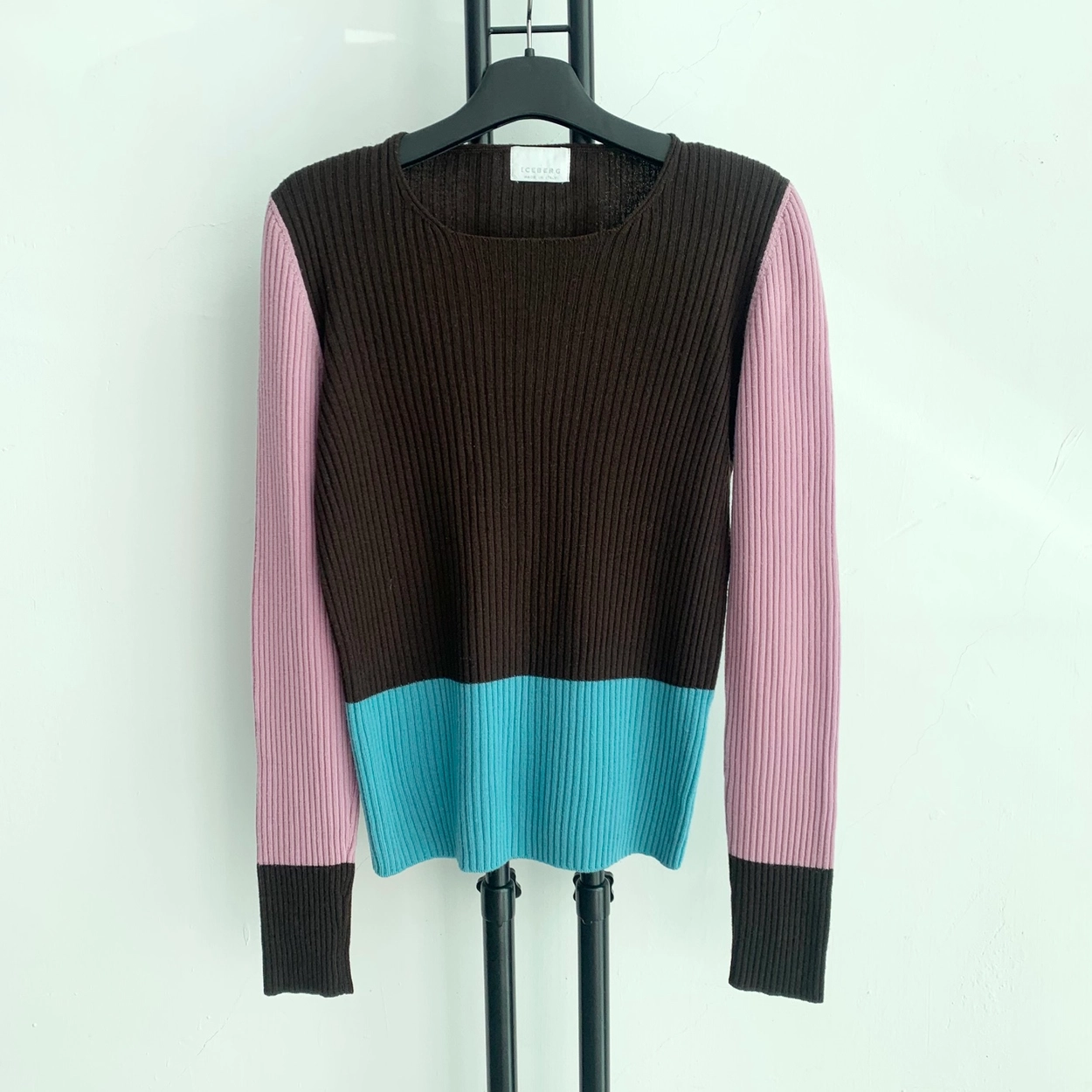 정품 아이스버그 ICEBERG 라나울 100 브라운 배색 골지 니트