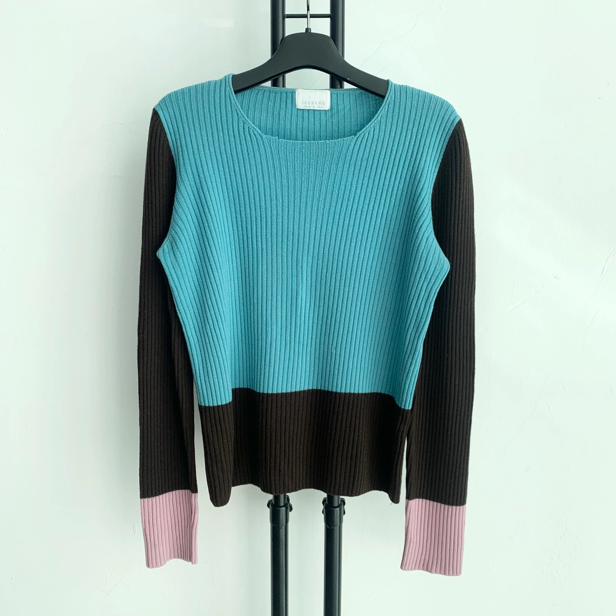 정품 아이스버그 ICEBERG 라나울 100 블루 배색 골지 니트