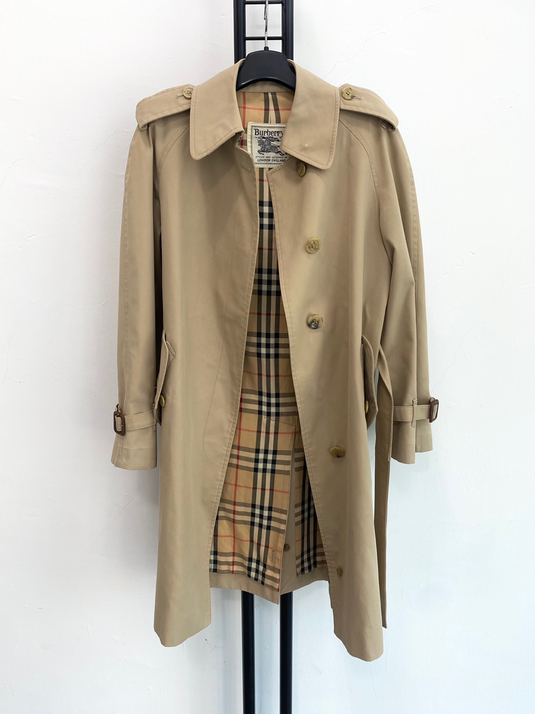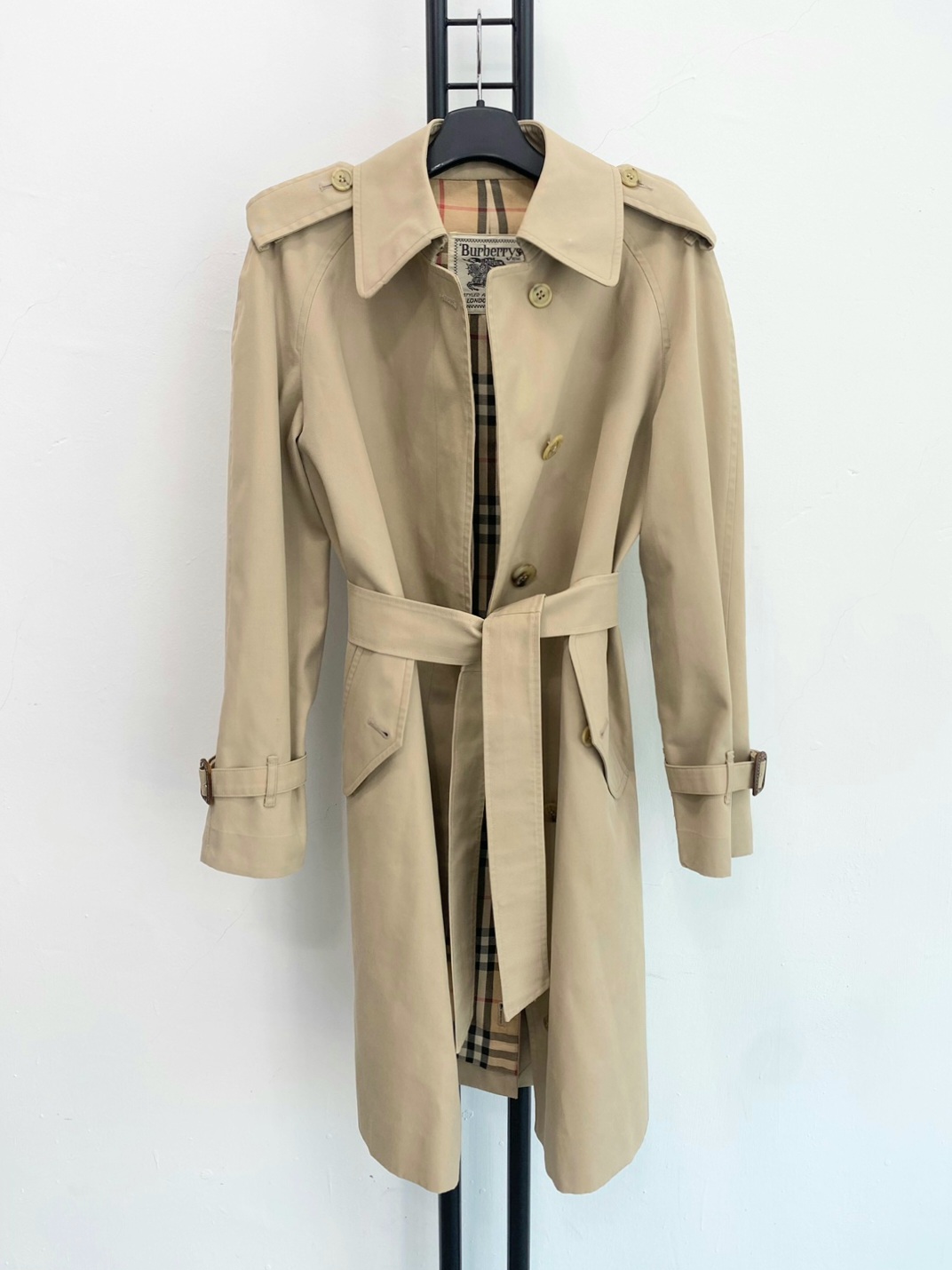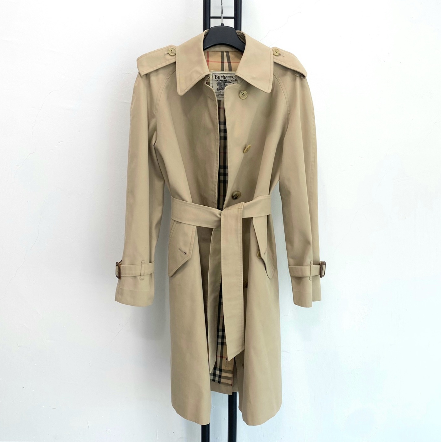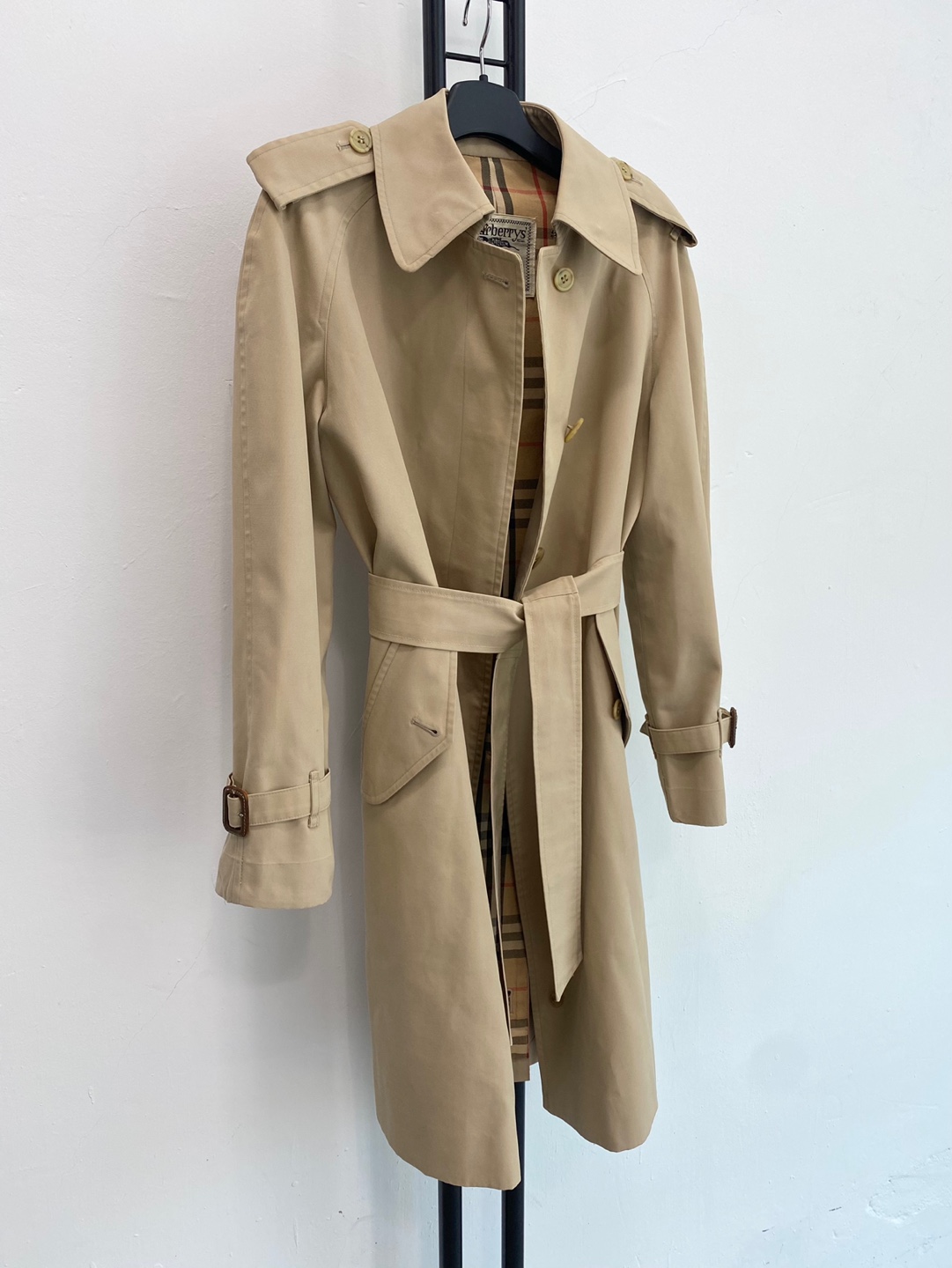 버버리만의 아이코닉한 베이지 톤과 체크 안감이 고급스러운 포인트를 더하며, 허리 벨트와 소매 스트랩으로 실루엣 조절이 가능합니다.