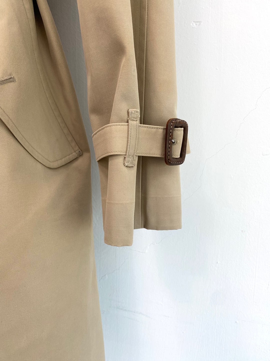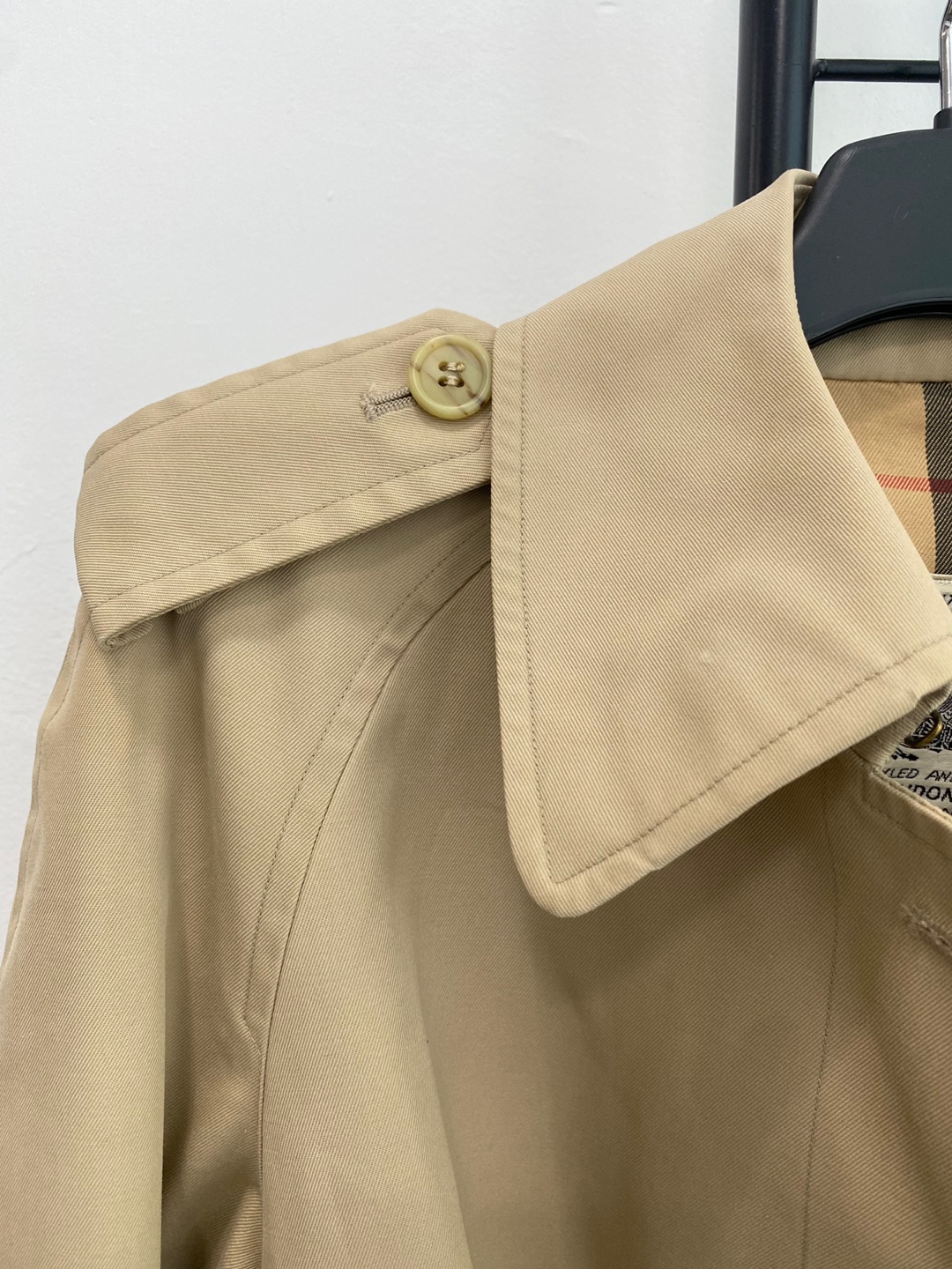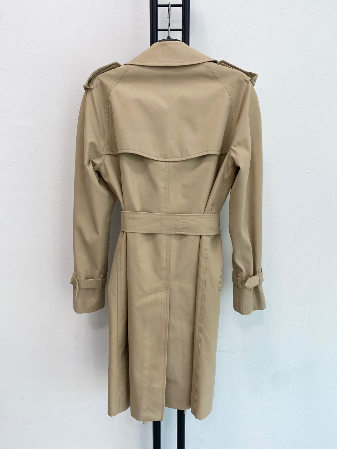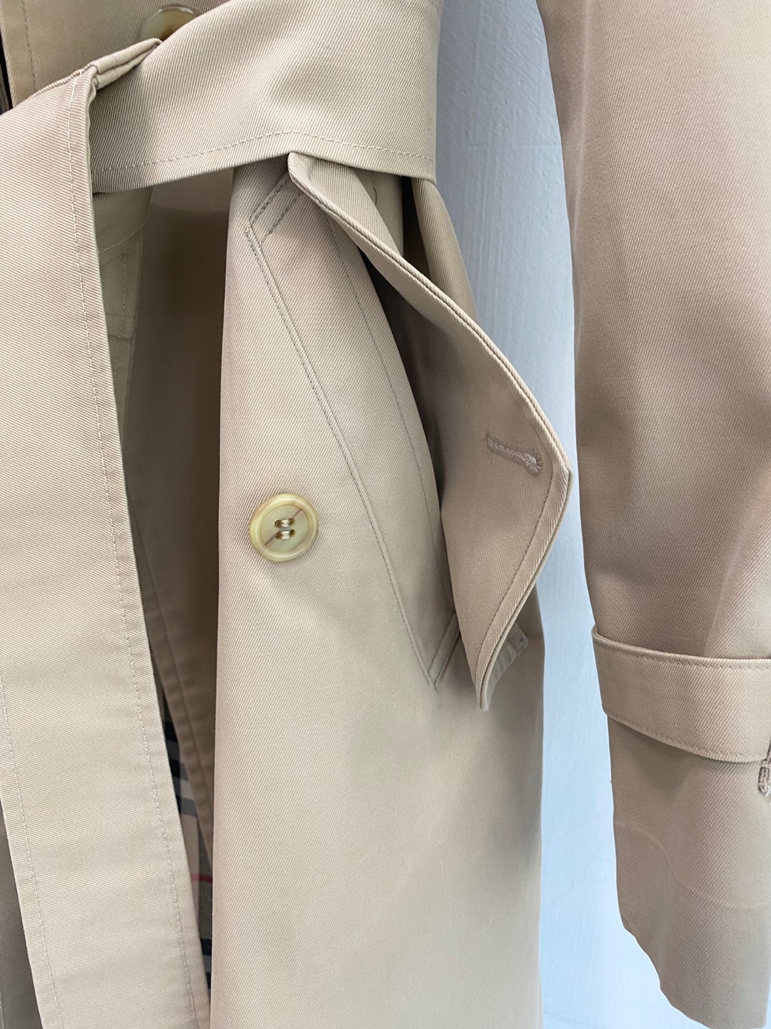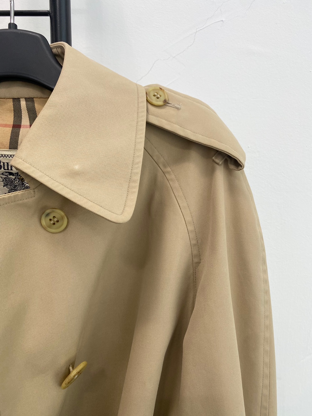 버버리만의 아이코닉한 베이지 톤과 체크 안감이 고급스러운 포인트를 더하며, 허리 벨트와 소매 스트랩으로 실루엣 조절이 가능합니다.