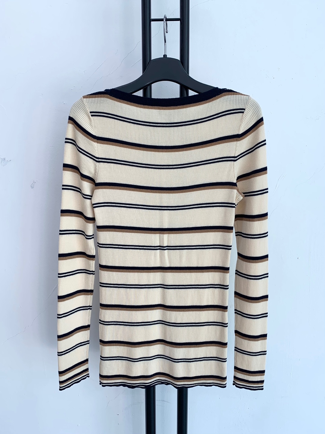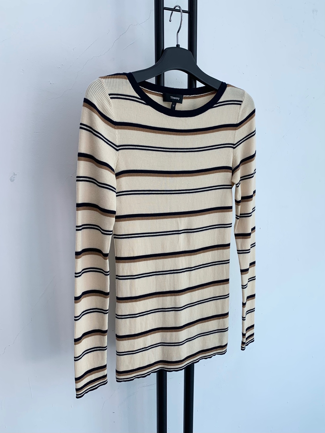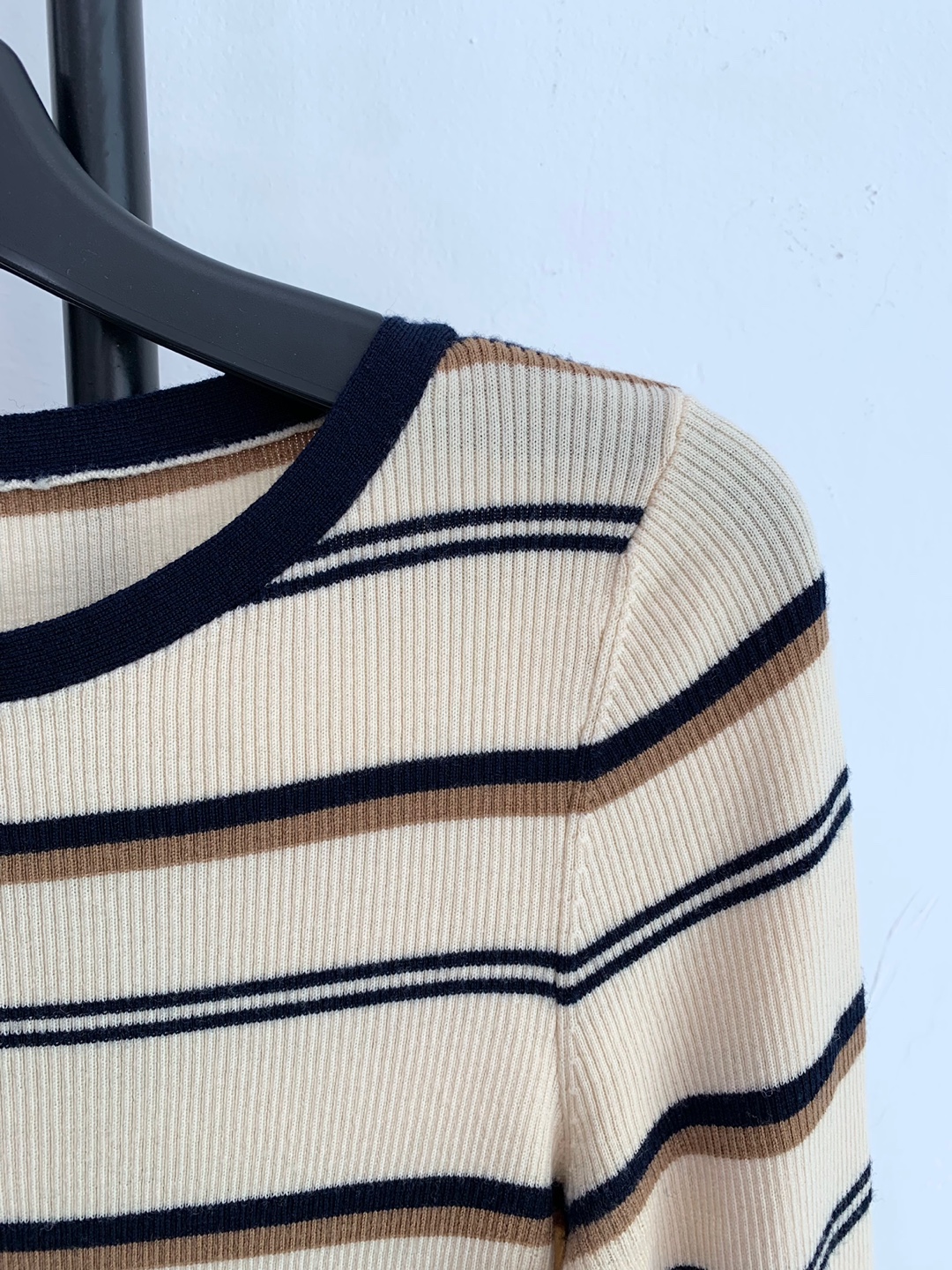 크림 컬러 바탕에 네이비·브라운 스트라이프 패턴이 세련된 포인트를 더하며,