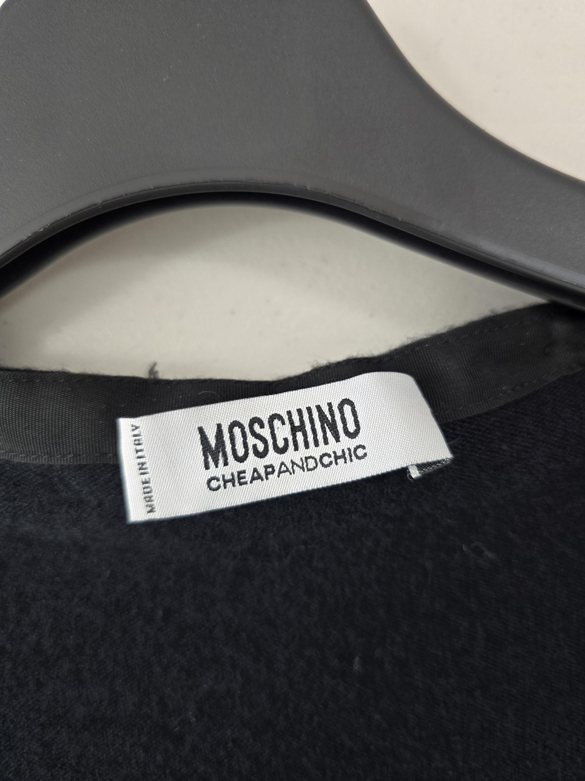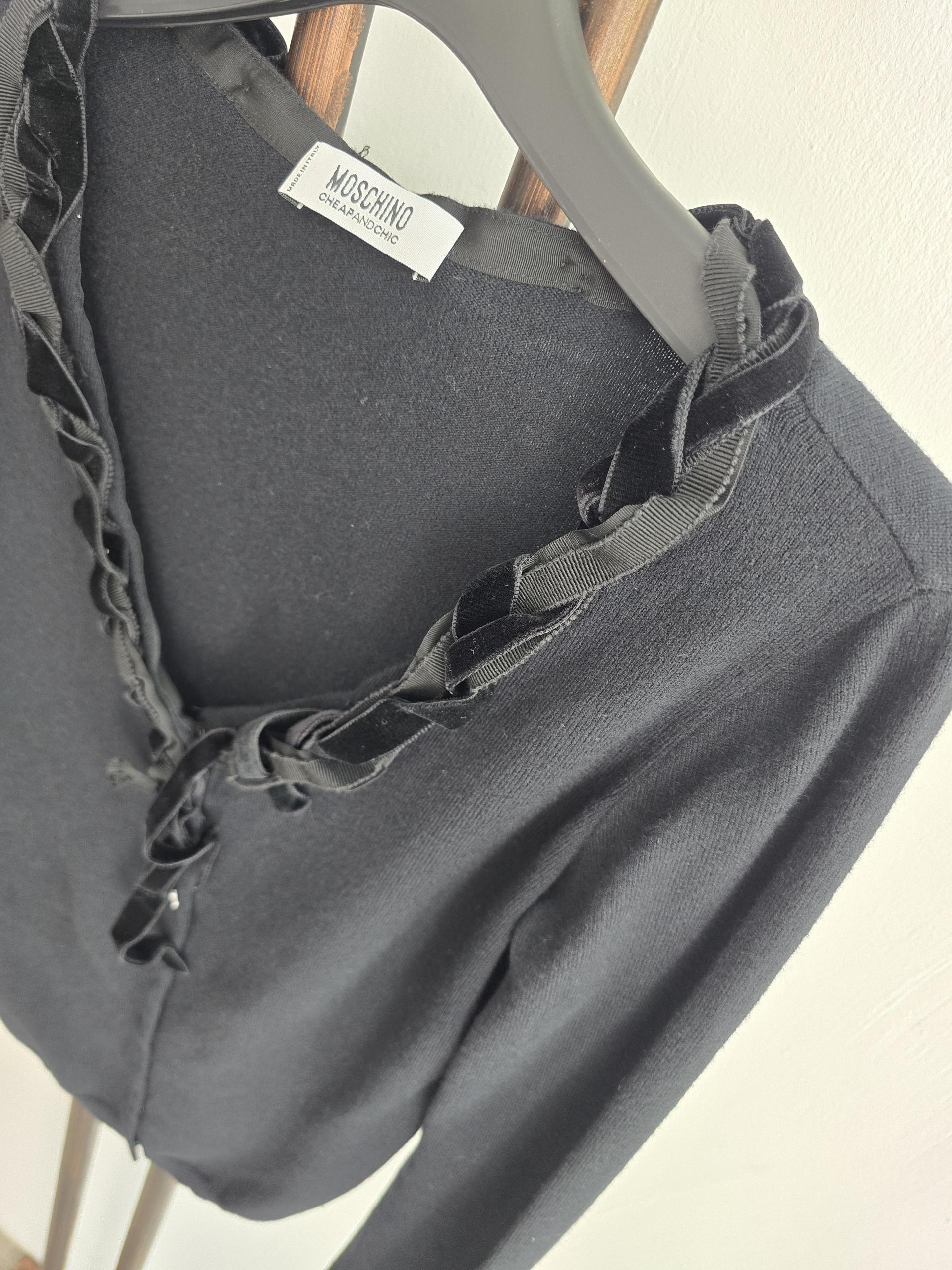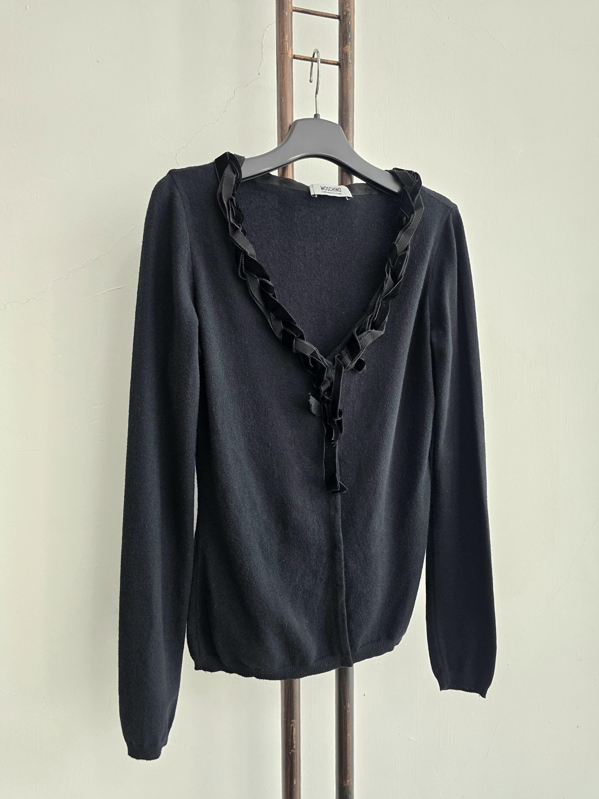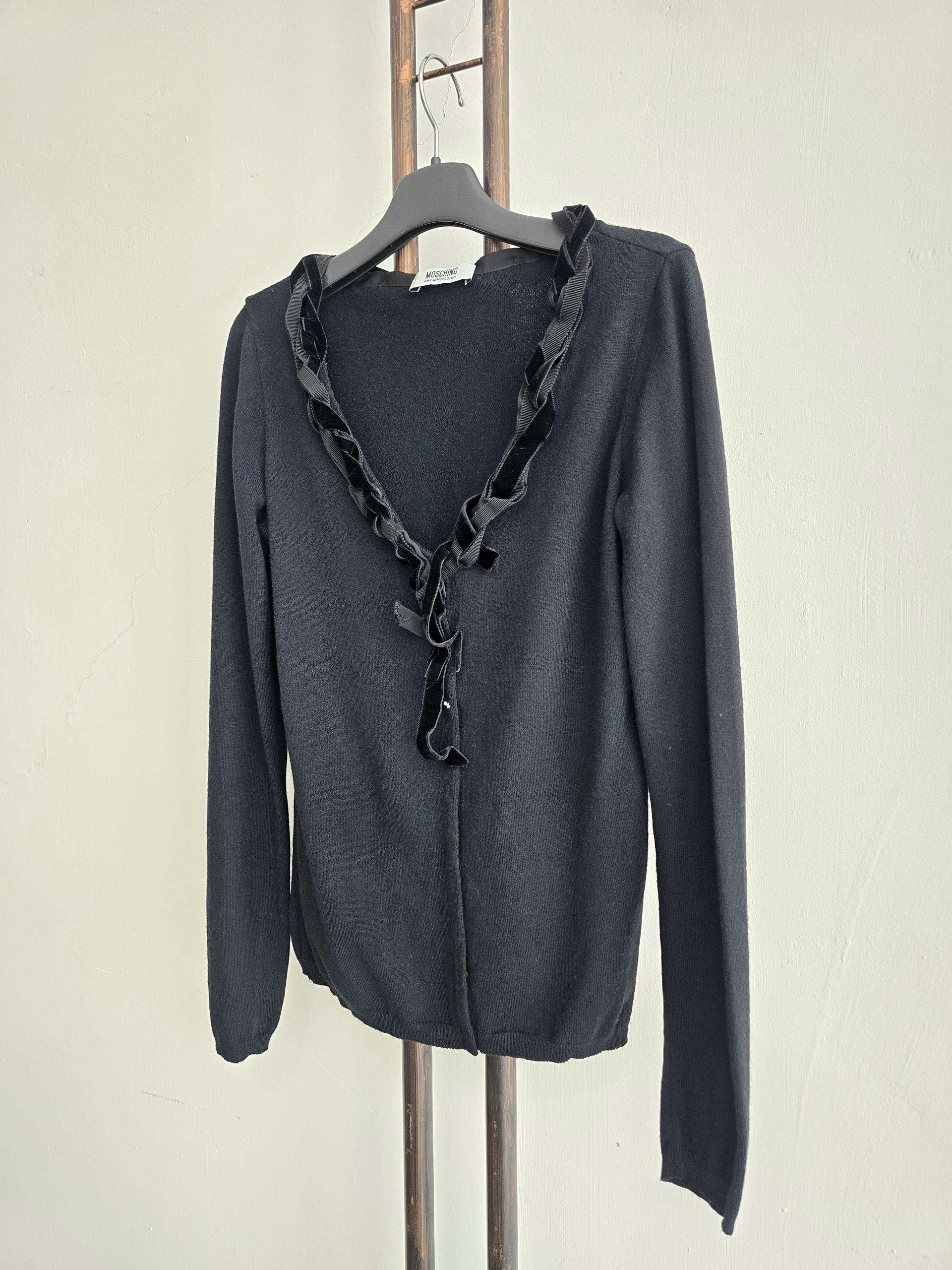 고급스러운 블랙 컬러에 러플 리본 디테일이 더해져 여성스러운 무드를 완성하는 정품 MOSCHINO 모 혼방 가디건.