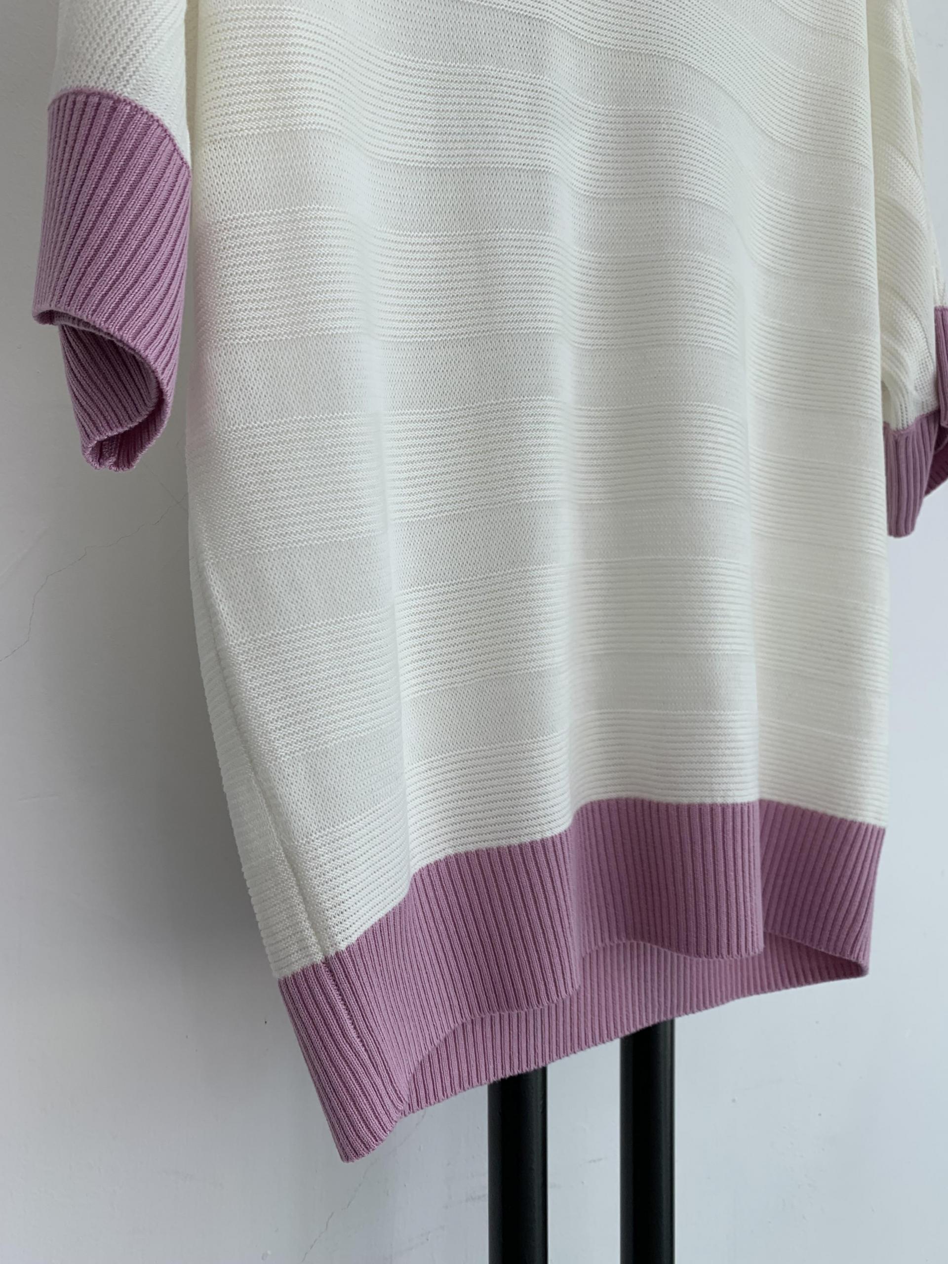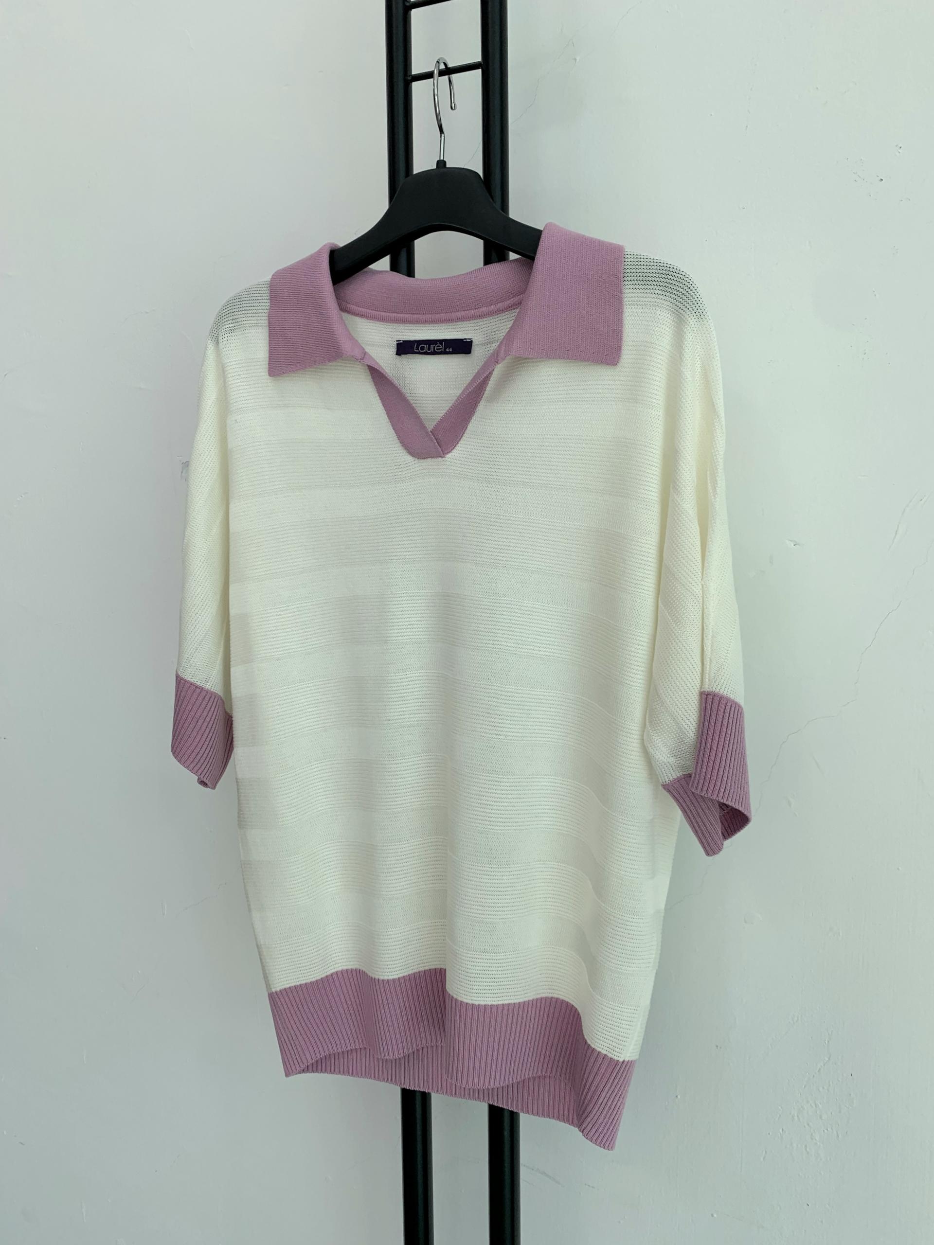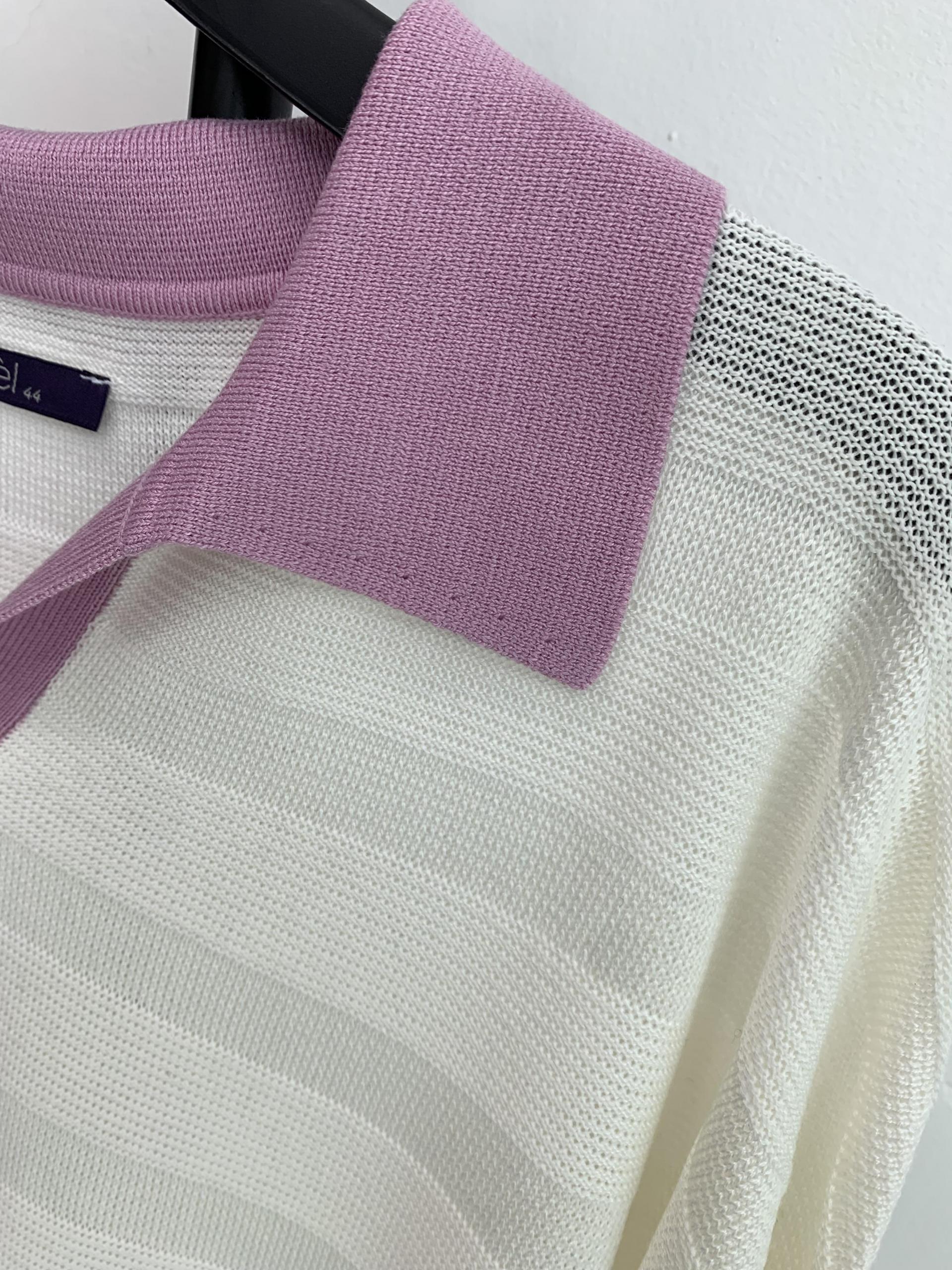 아이보리 컬러 바디에 라일락빛 카라와 소매, 밑단 배색이 더해져 산뜻하면서도