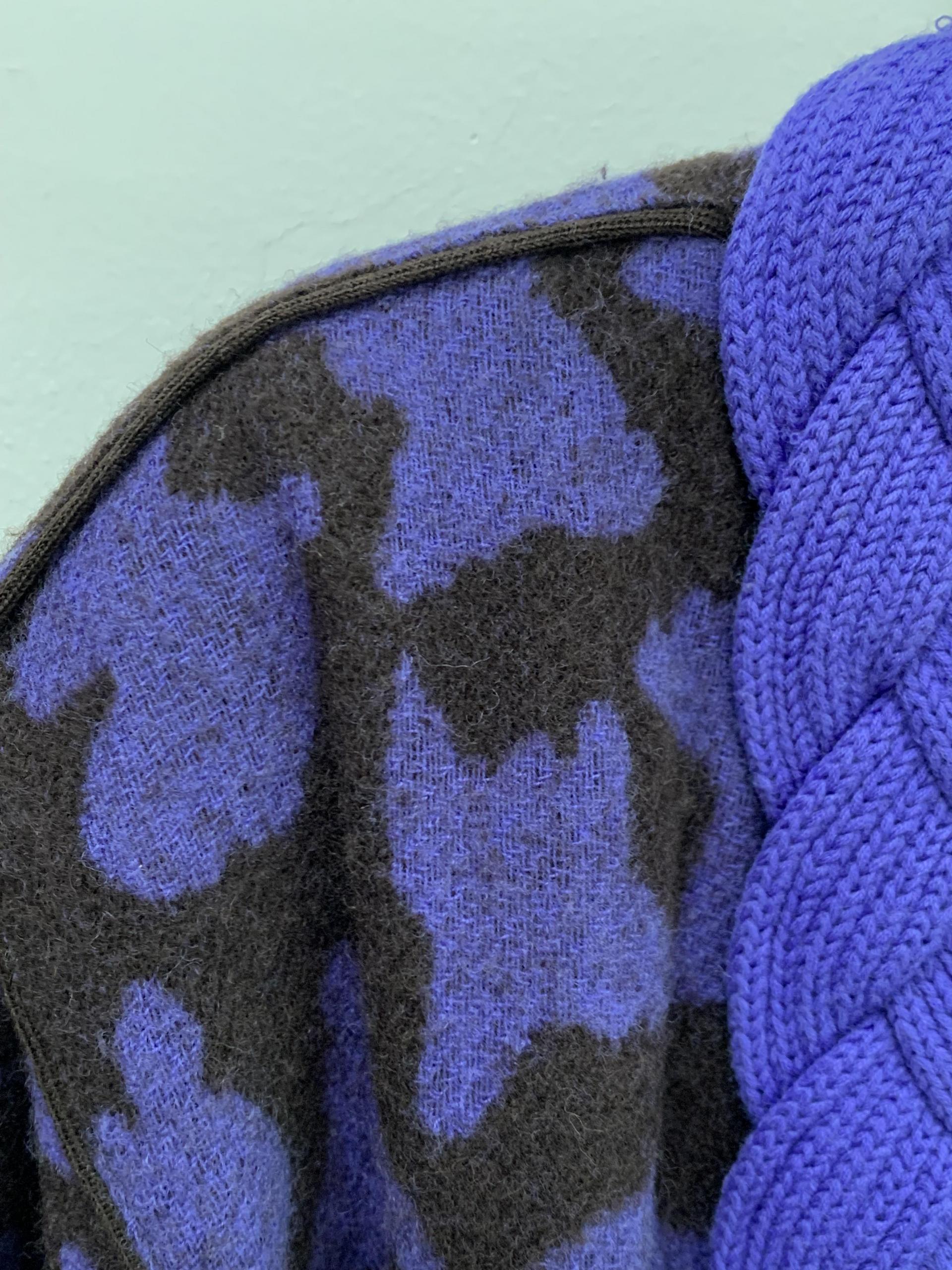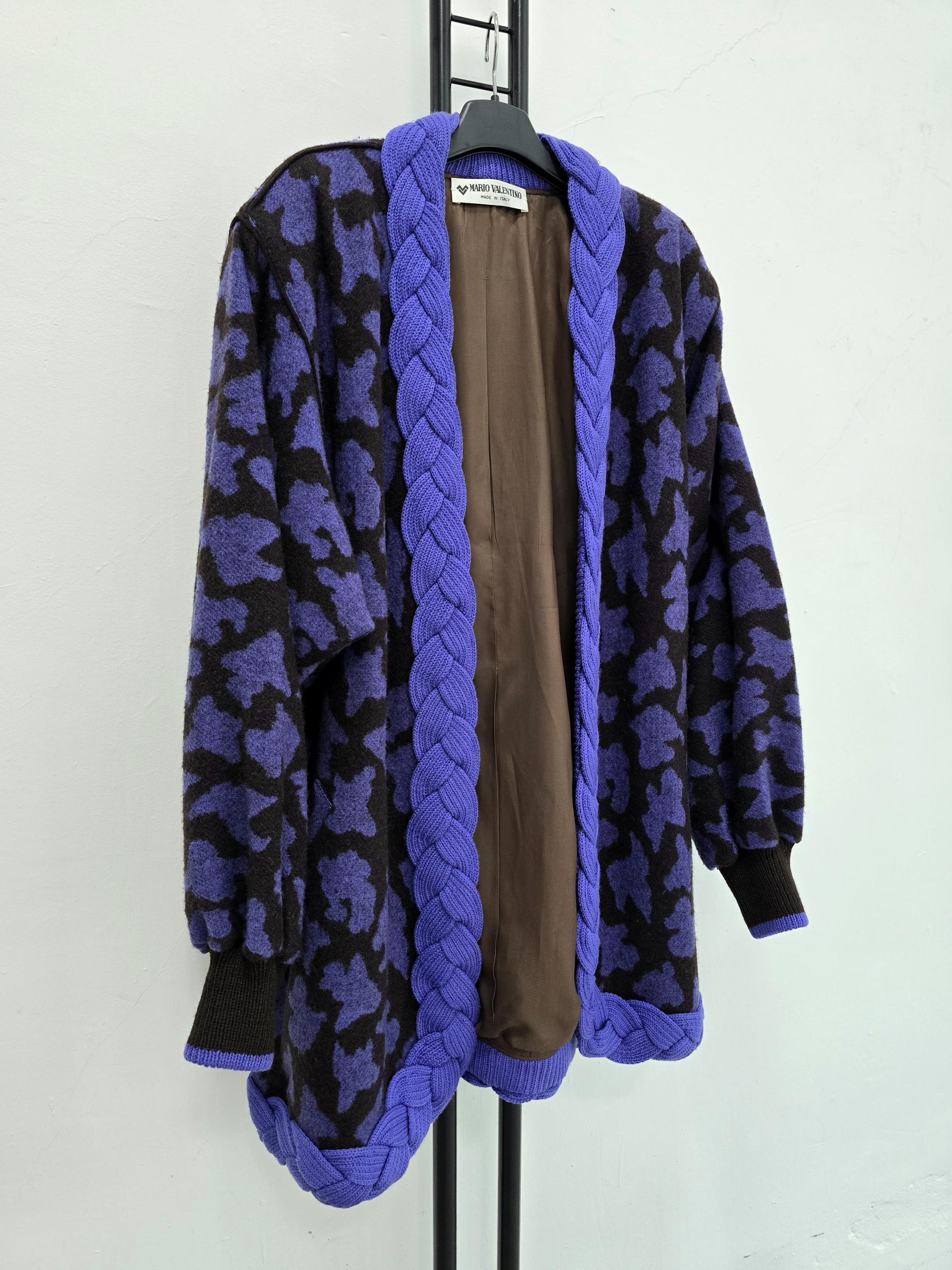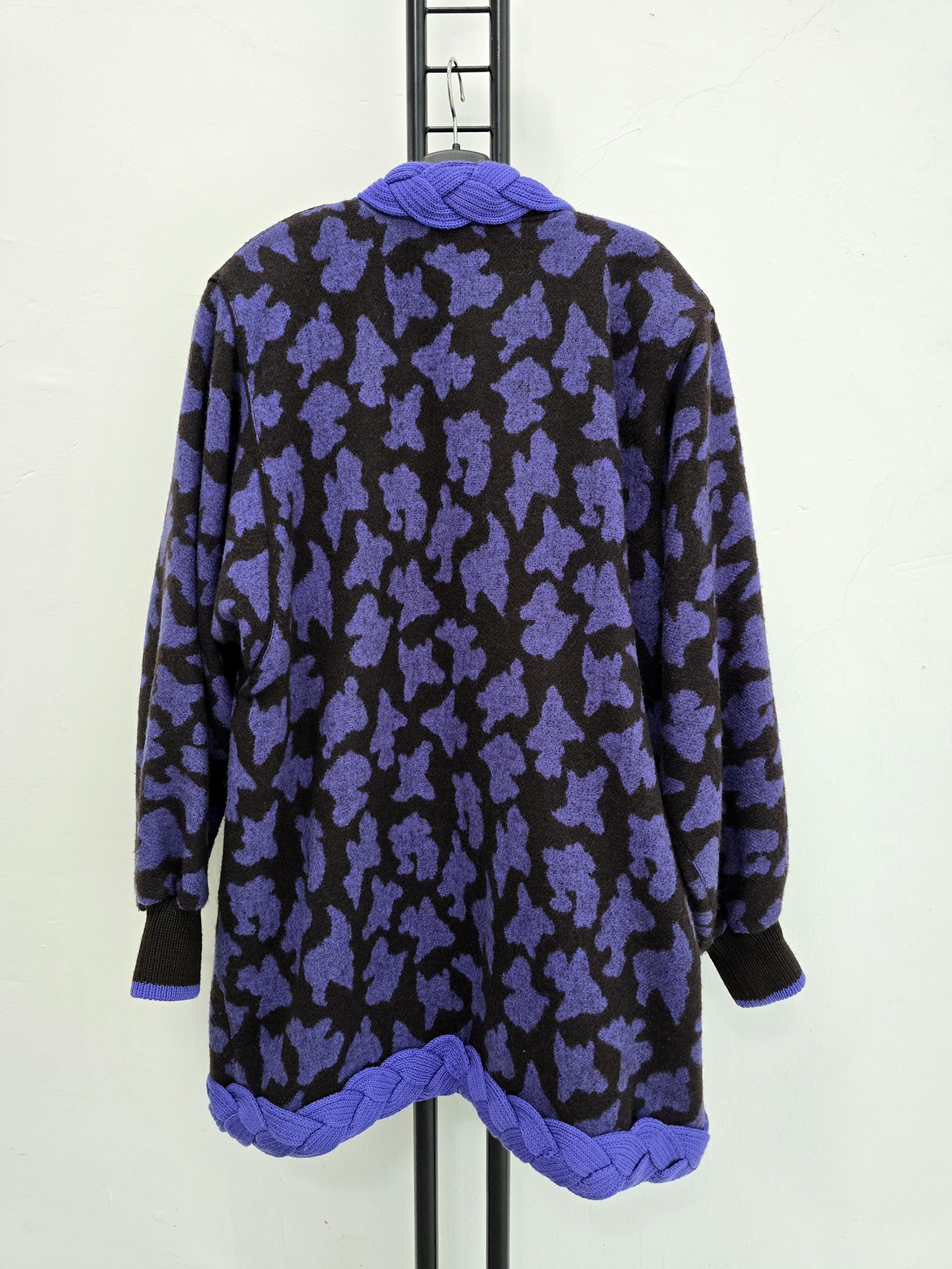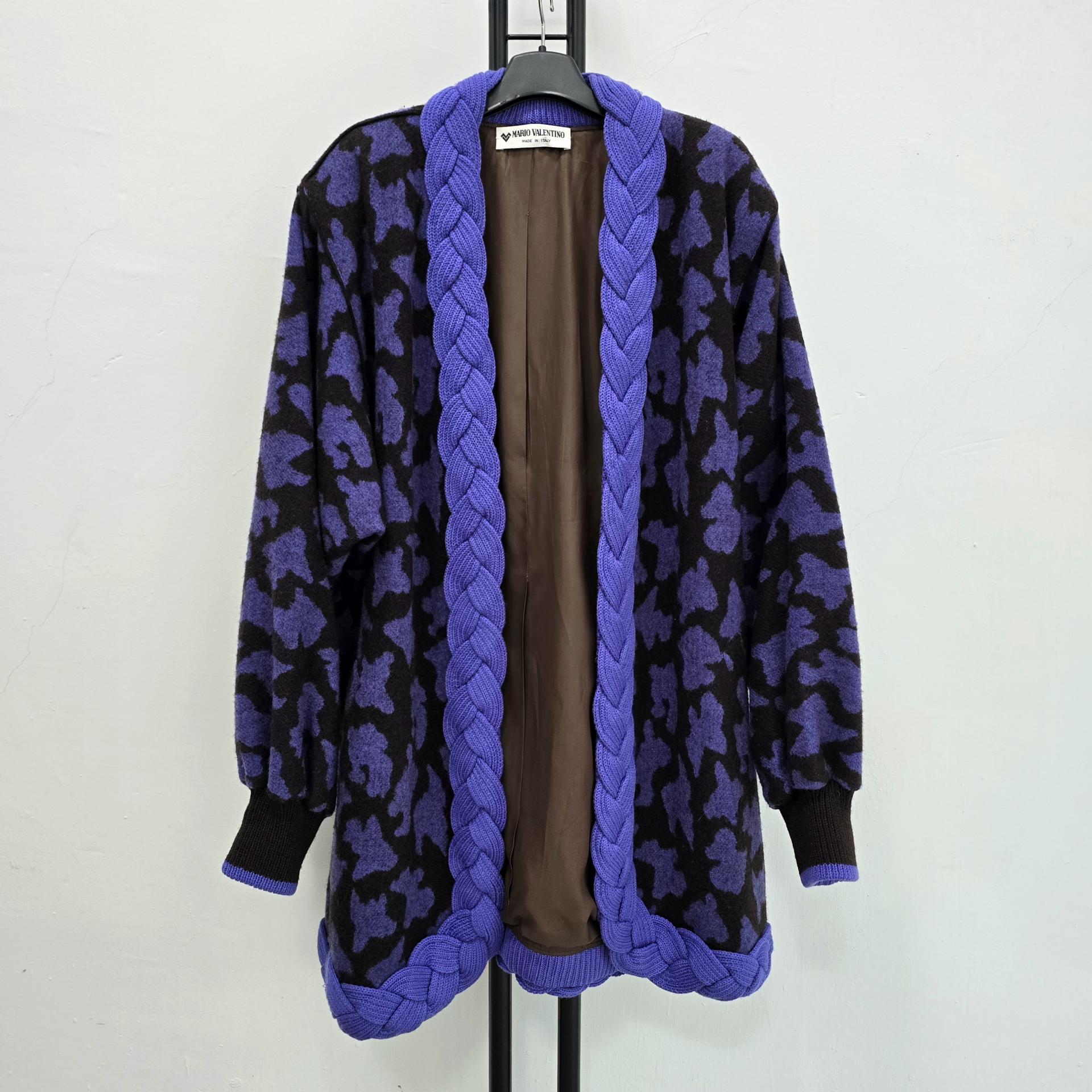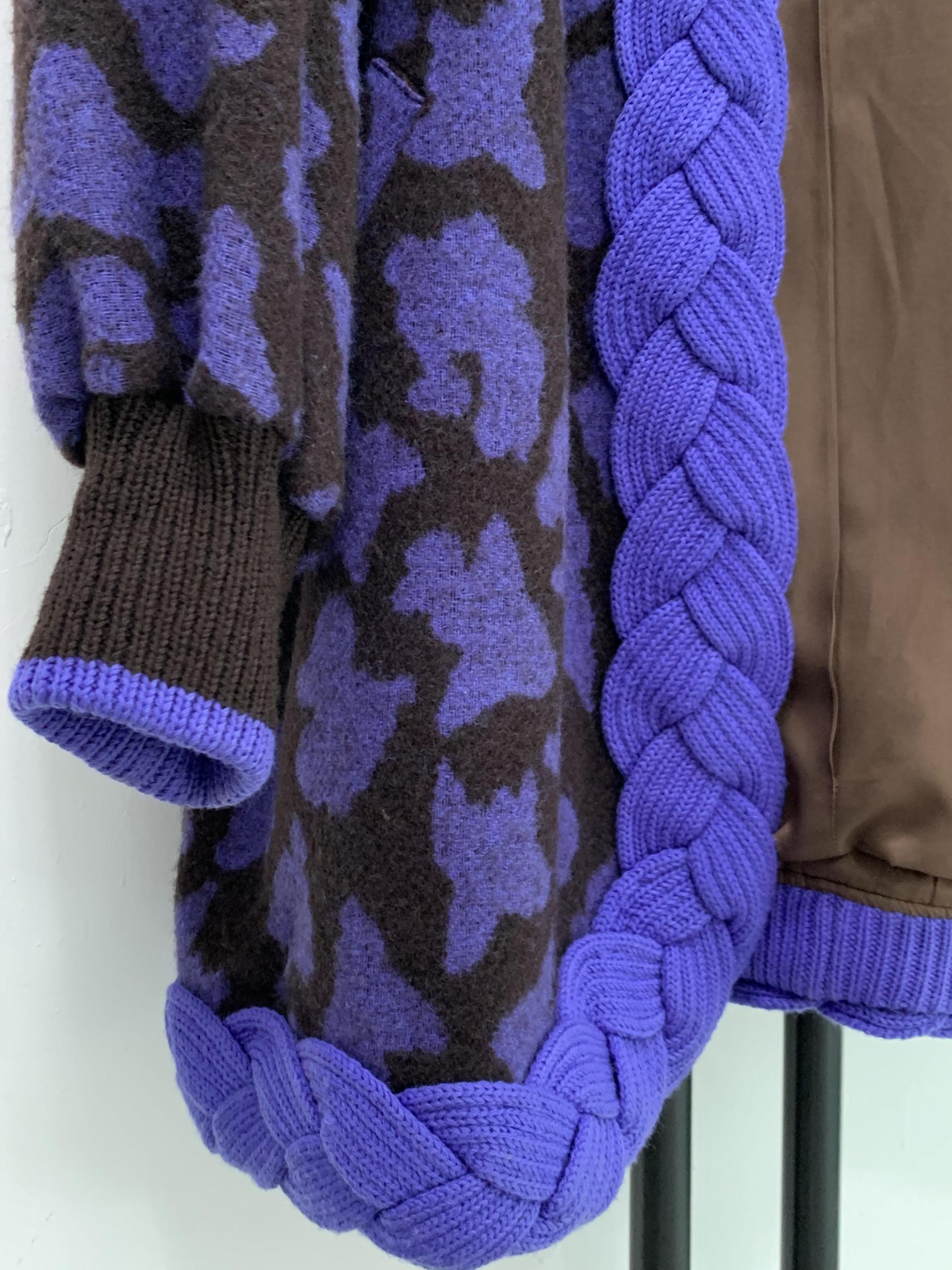 퍼플과 브라운 패턴이 세련된 대비를 이루며, 굵은 꽈배기 짜임 디테일이 포인트를 더합니다.