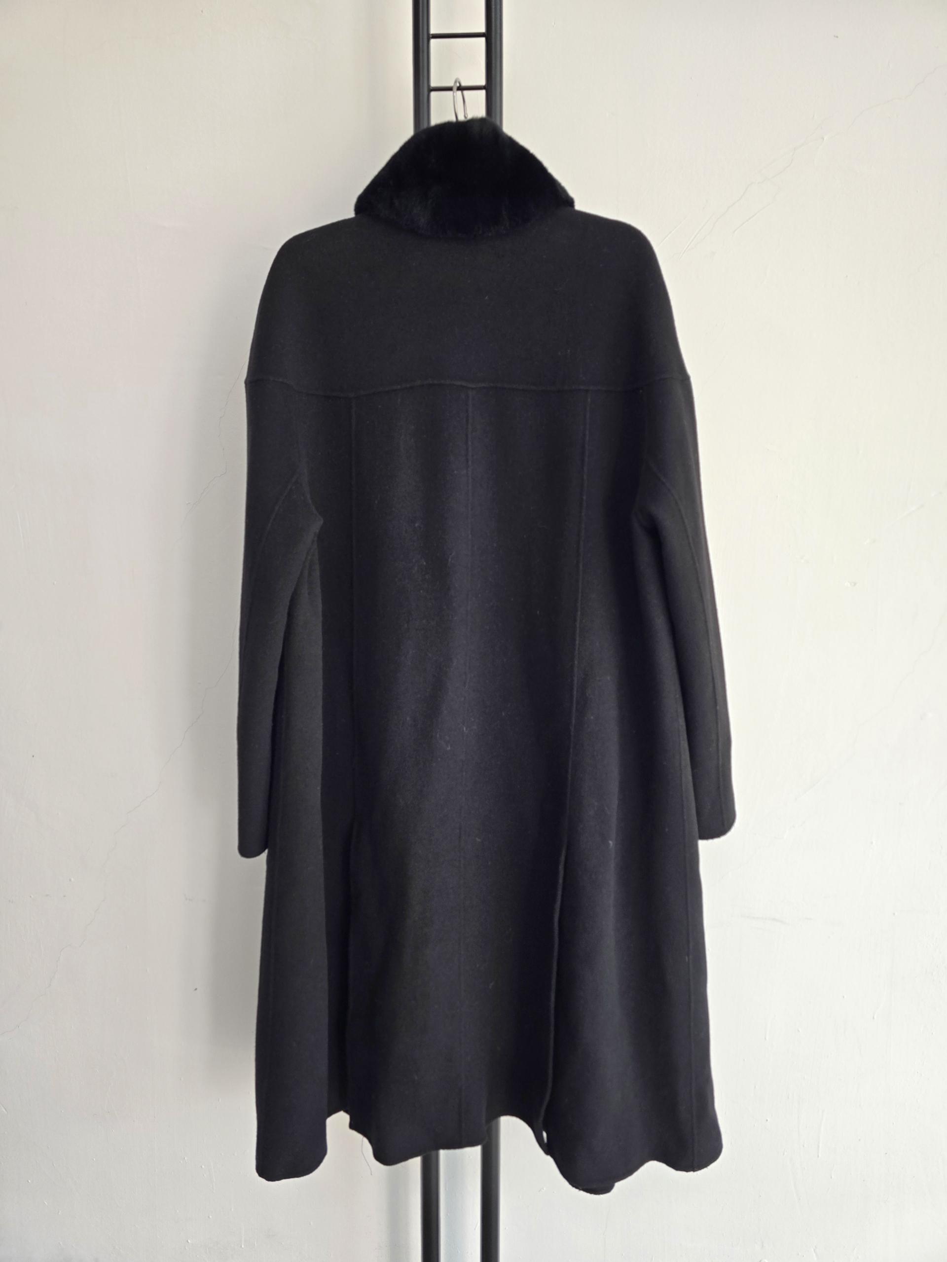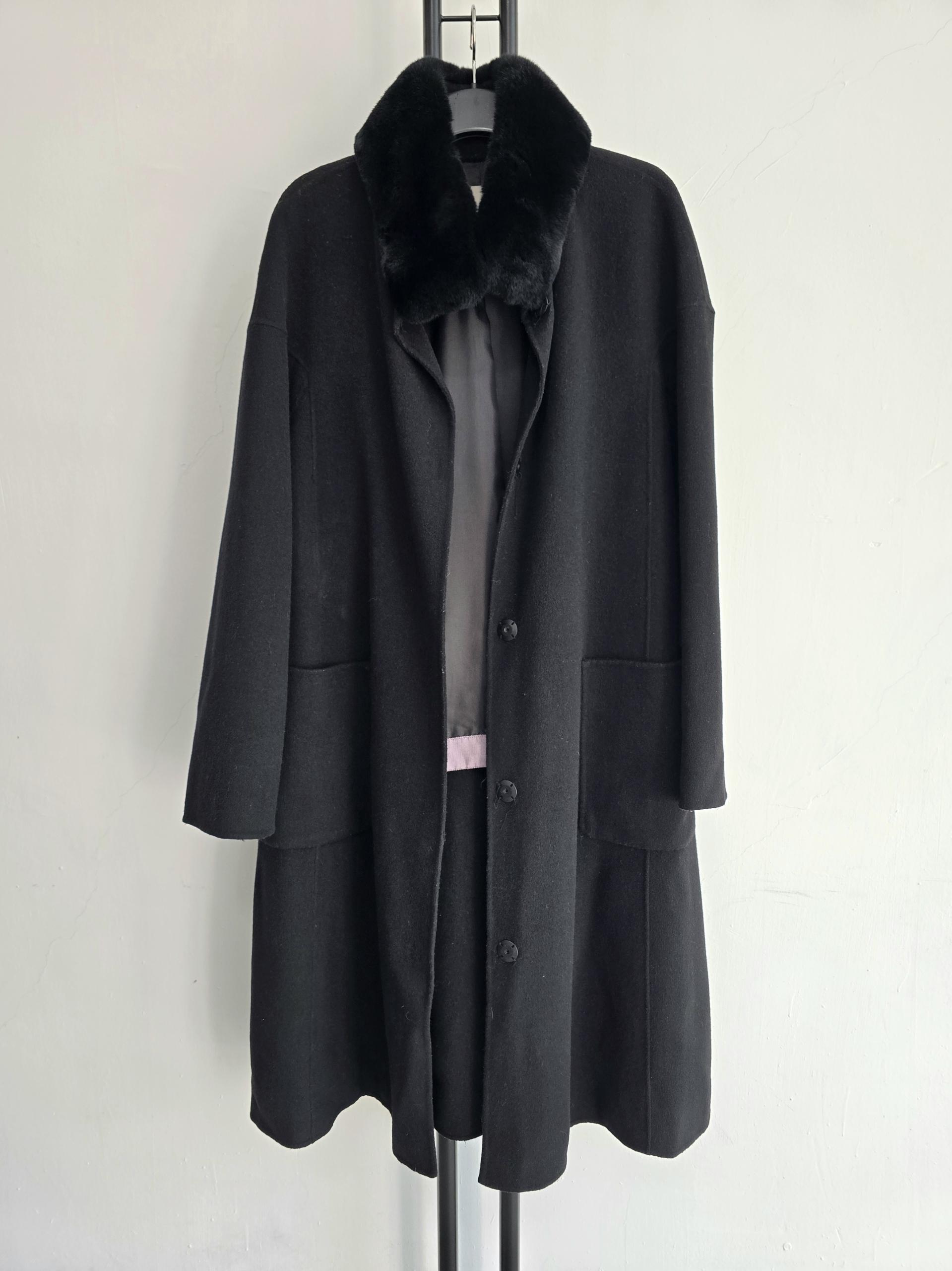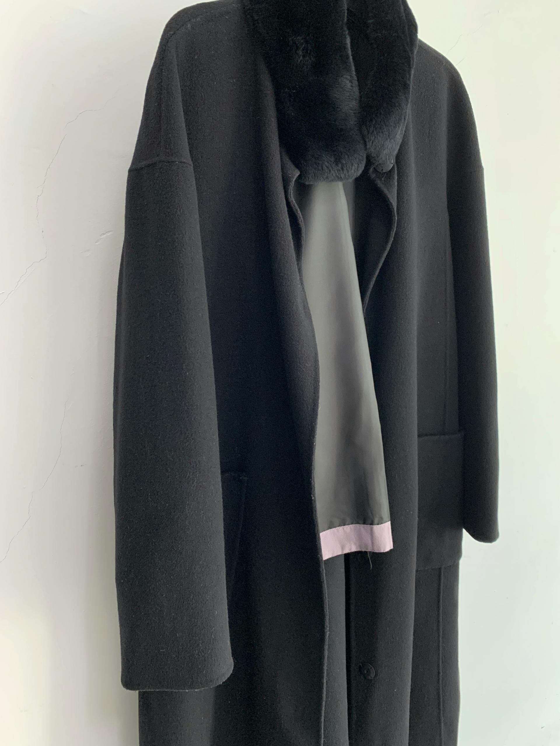 고급스러운 블랙 천연모피 토끼털 카라가 포인트입니다. 상태 좋은 코트 저렴하게 판매합니다.