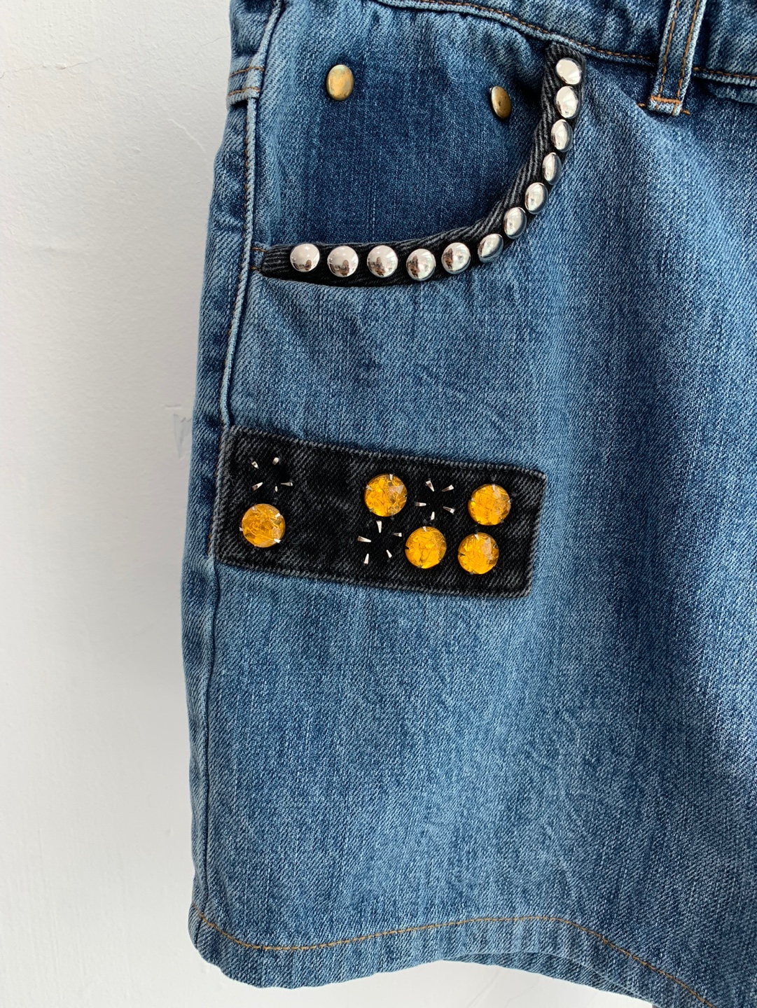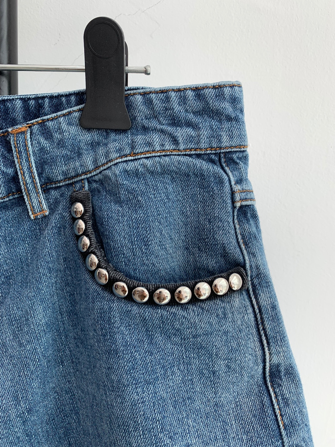 스터드 장식과 패치워크 디테일이 유니크한 매력을 더합니다.