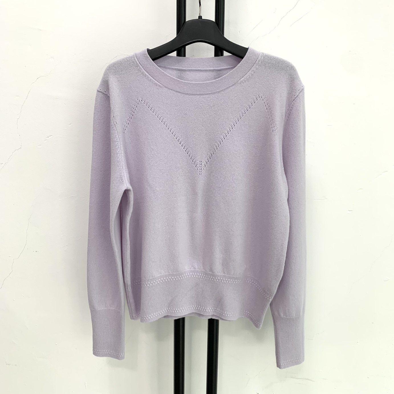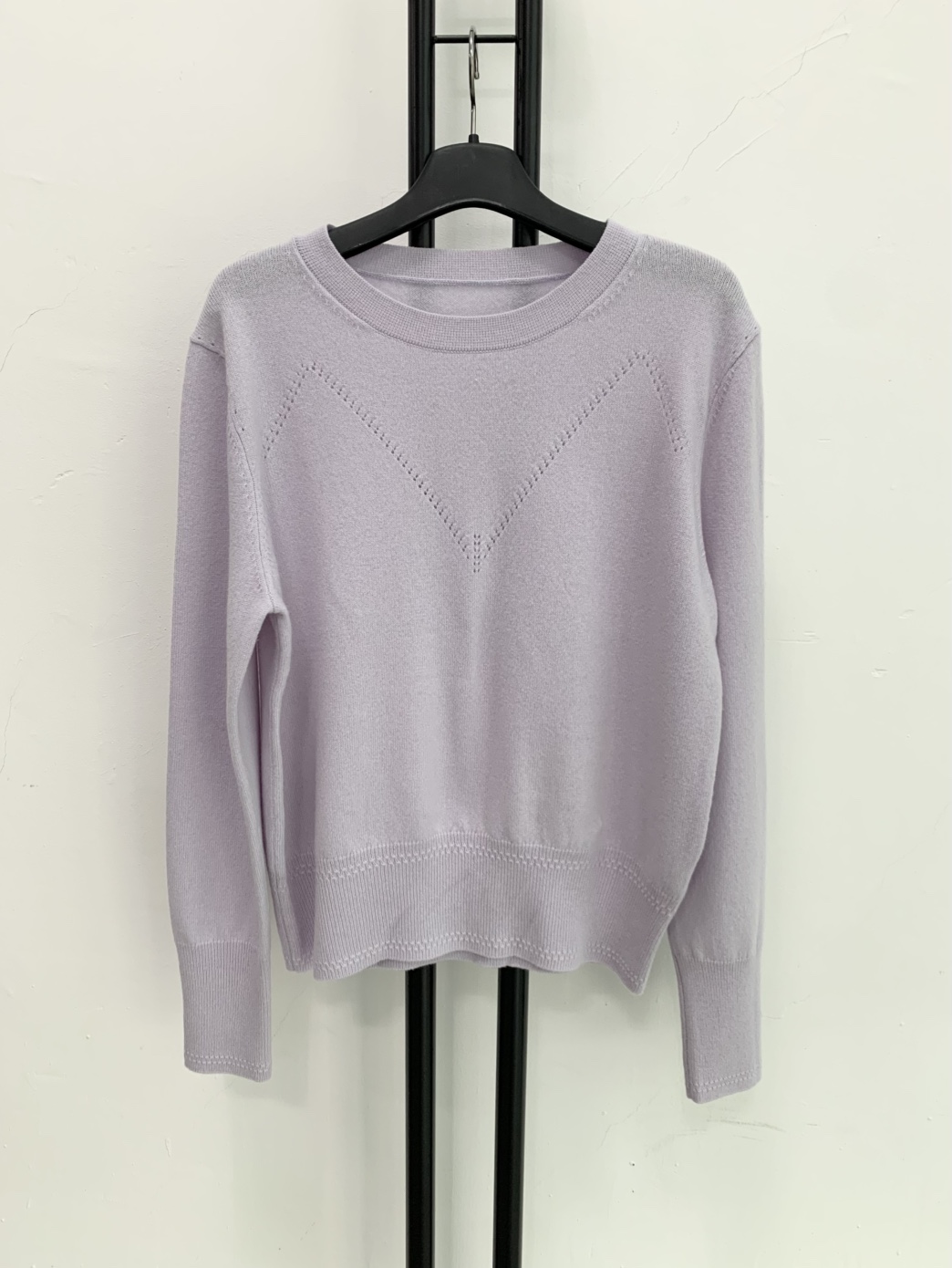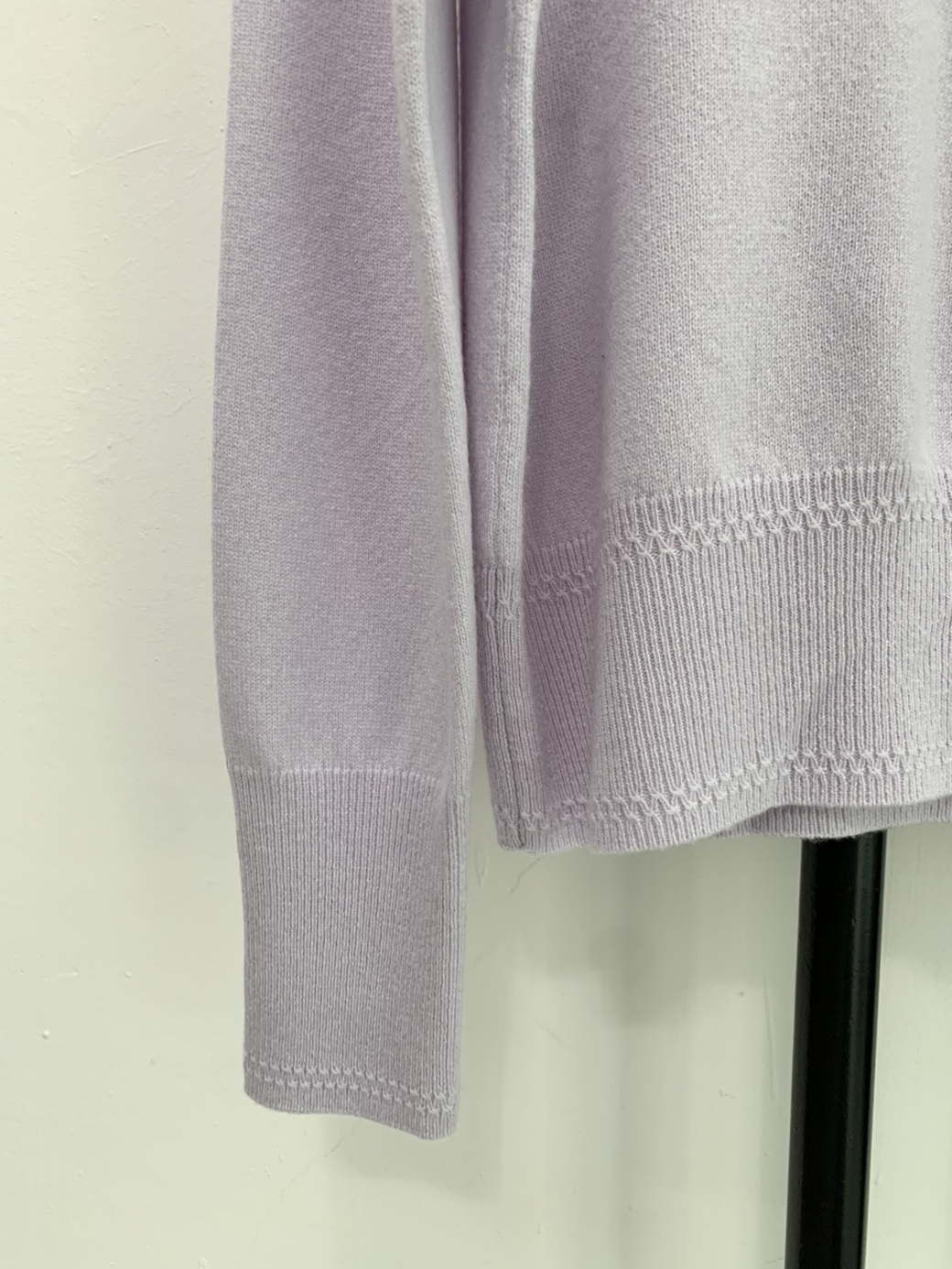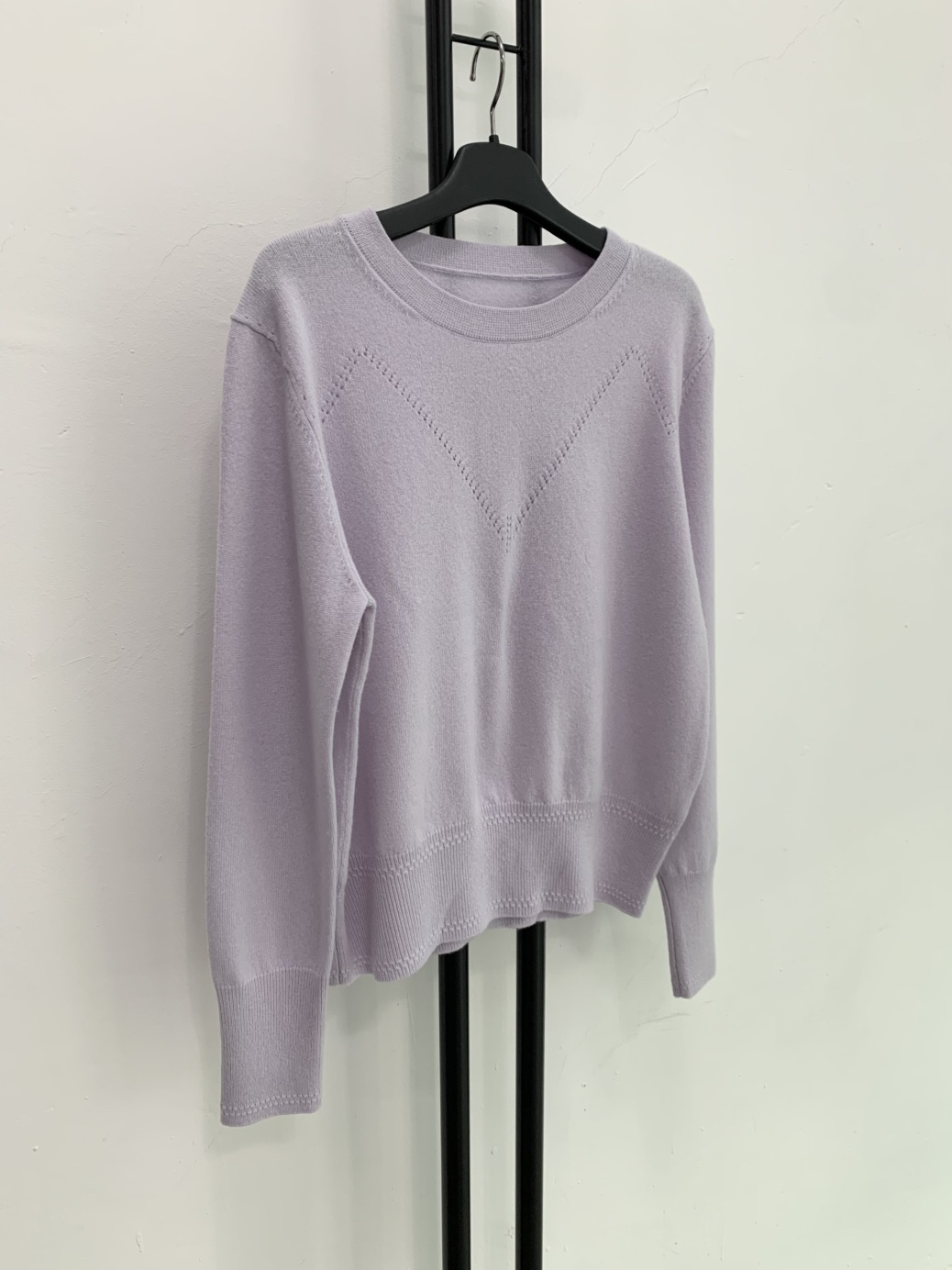 울 캐시미어 혼방의 고급스러운 연보라색 니트입니다.