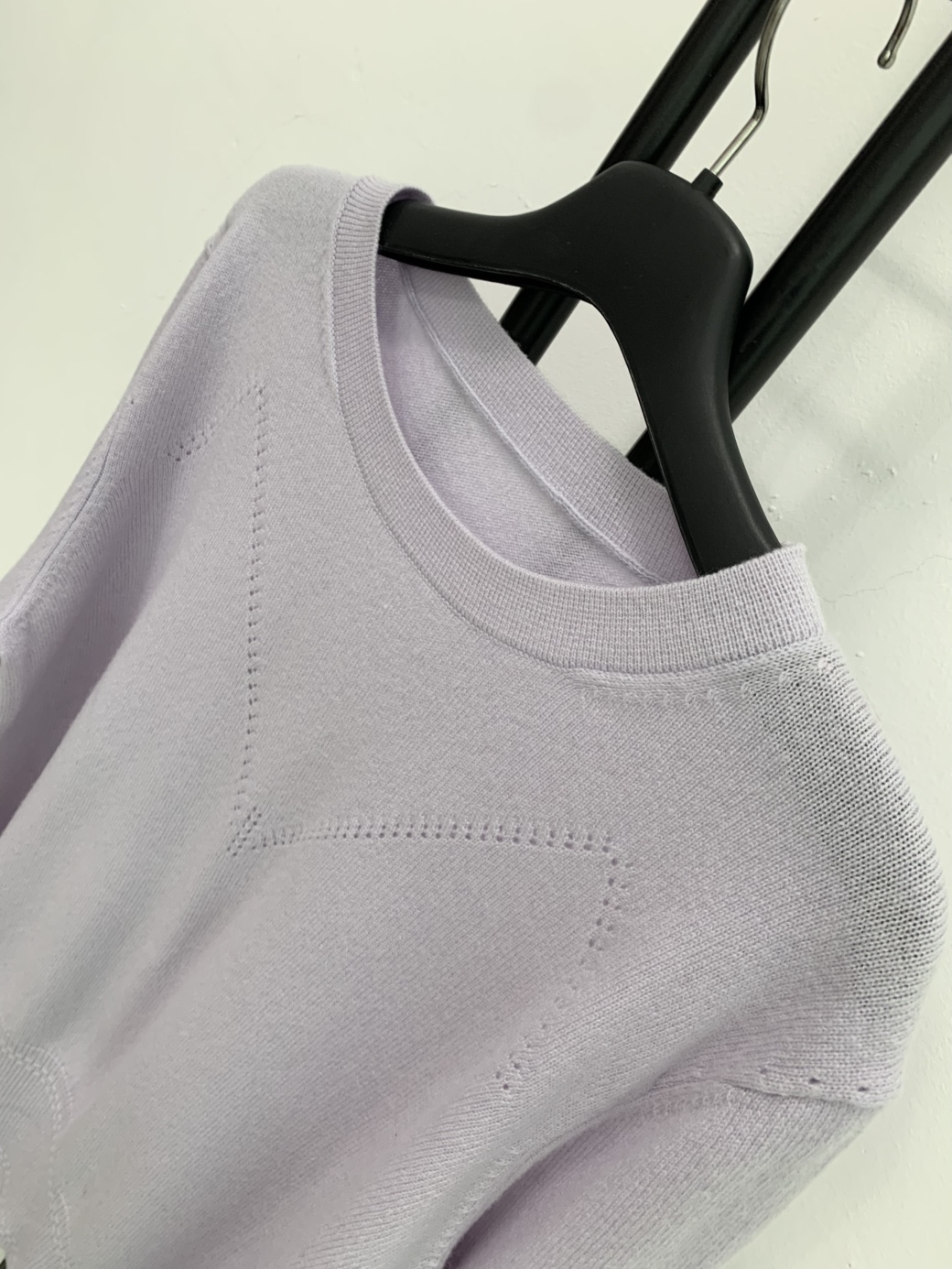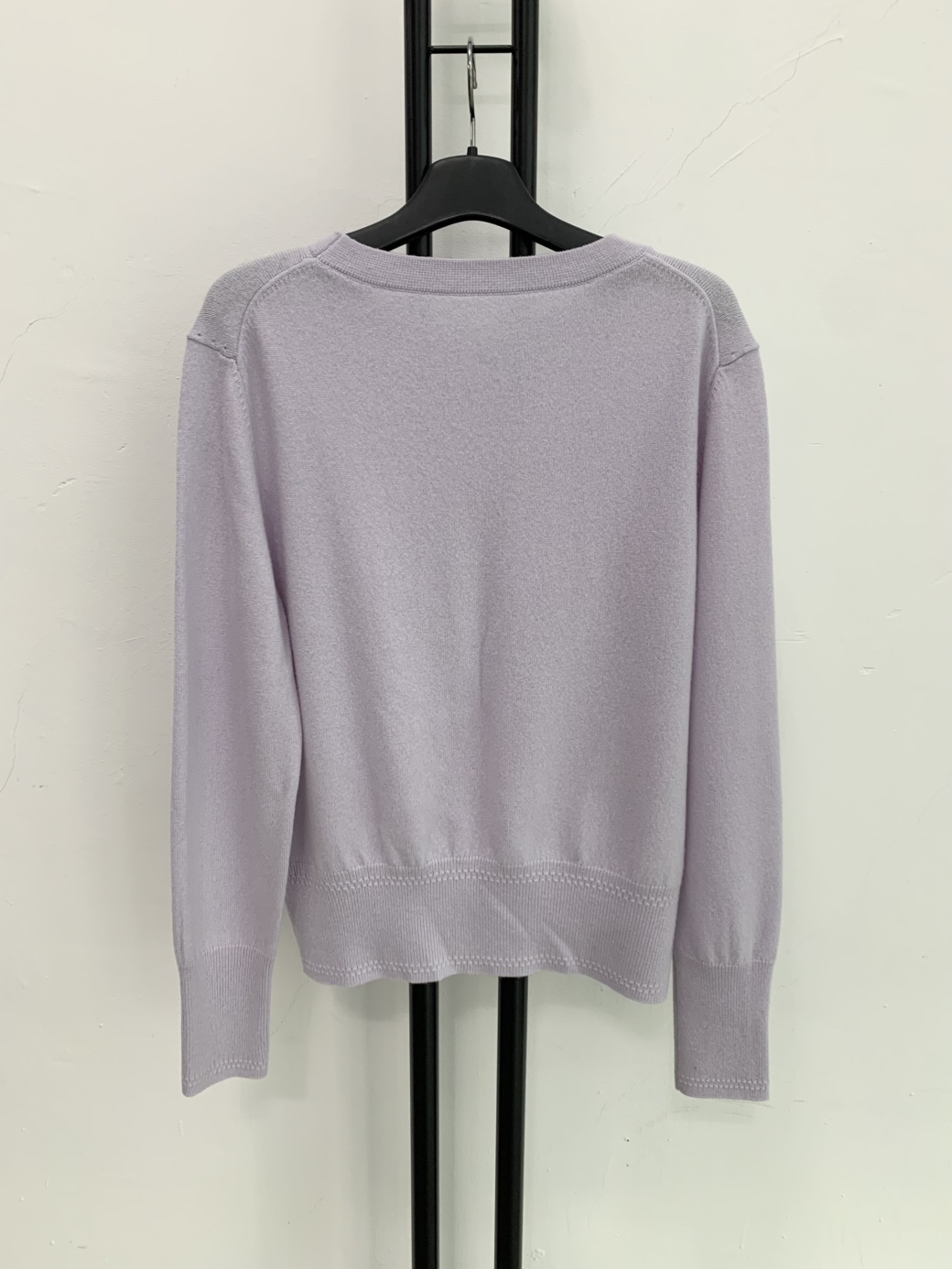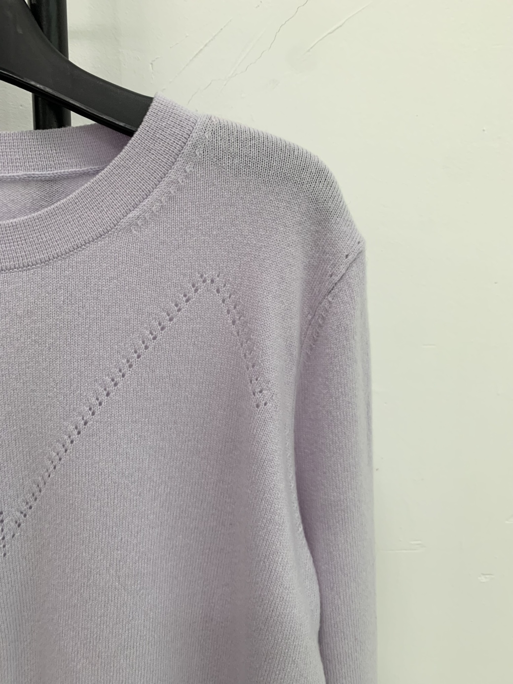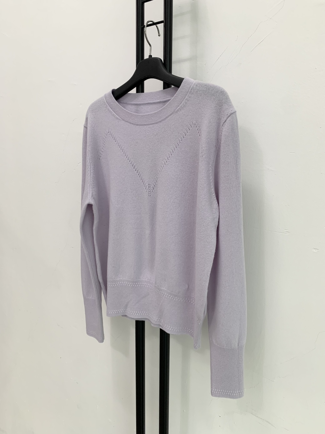 울 캐시미어 혼방의 고급스러운 연보라색 니트입니다.