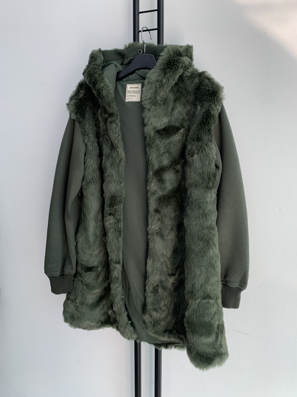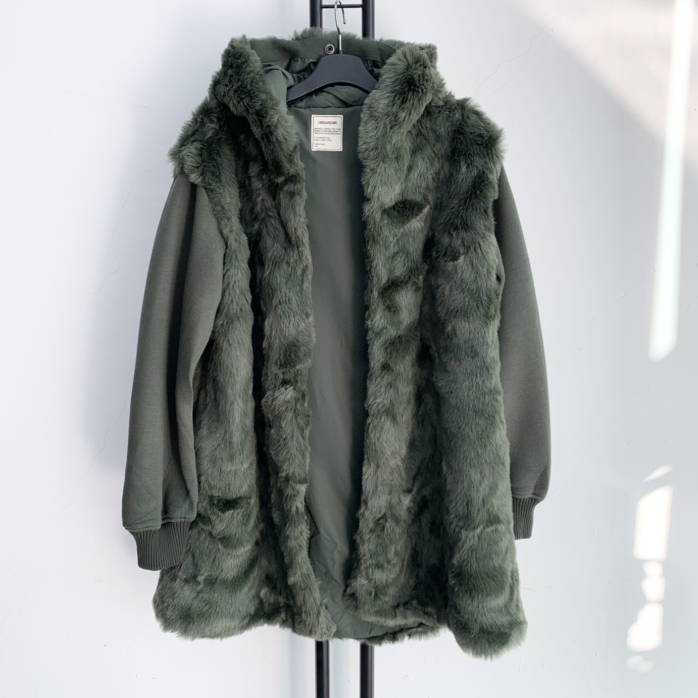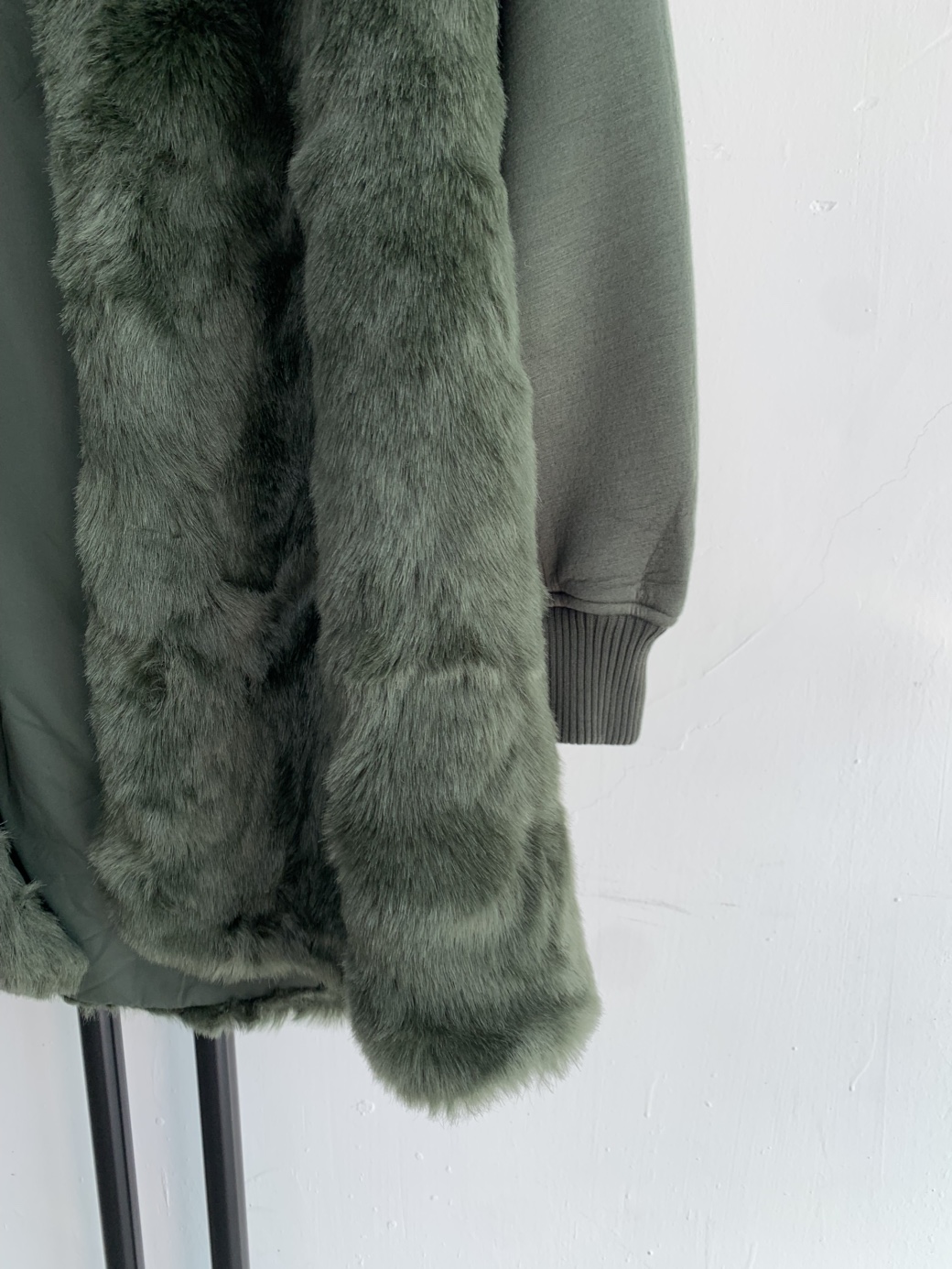 카키색상에 퍼 후드가 포인트로 달려있습니다. 기장이 넉넉해서 코트처럼 활용하기 좋아요.