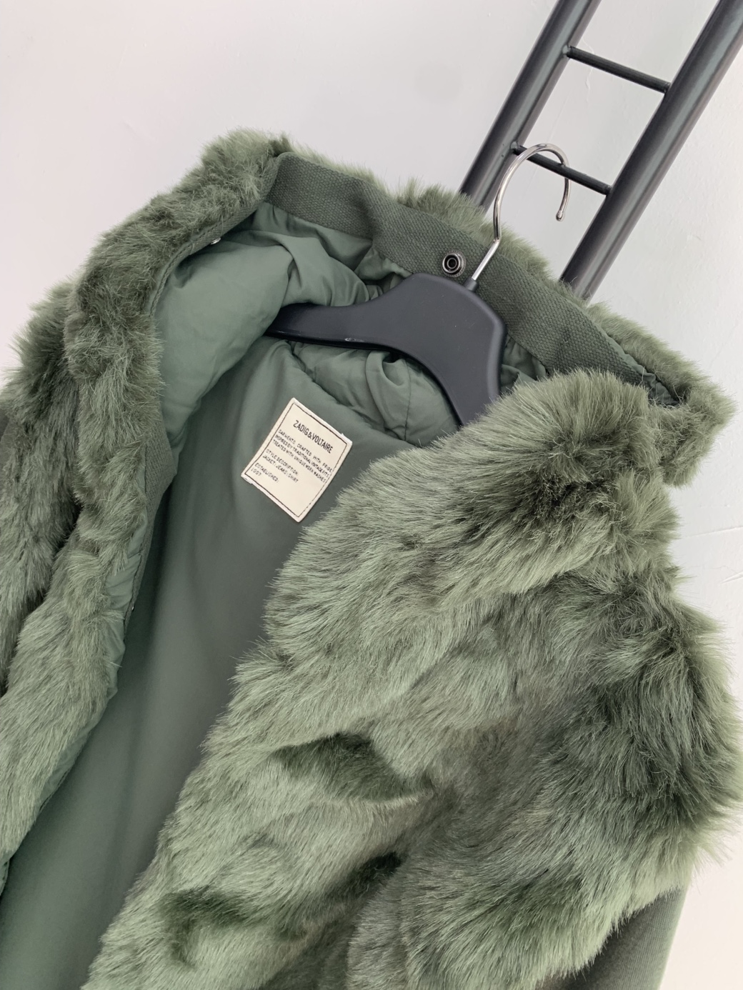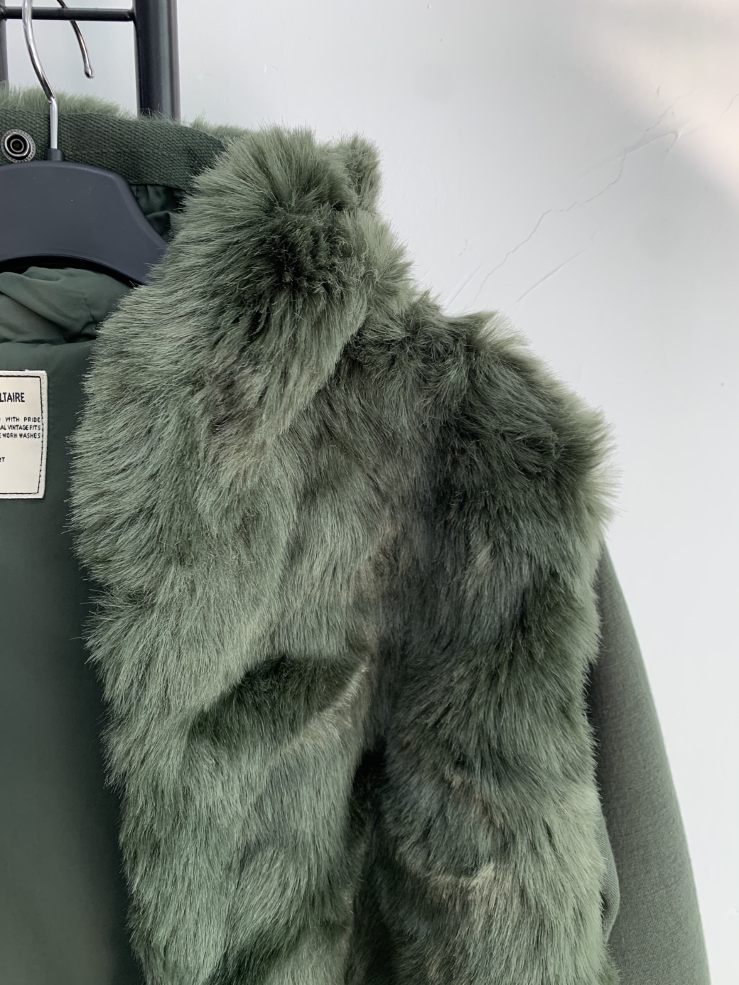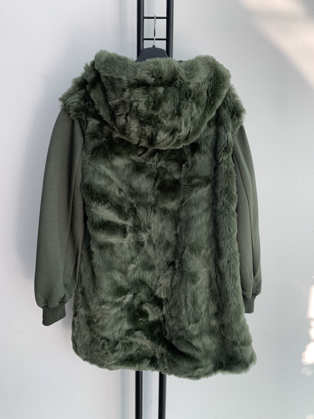 카키색상에 퍼 후드가 포인트로 달려있습니다. 기장이 넉넉해서 코트처럼 활용하기 좋아요.