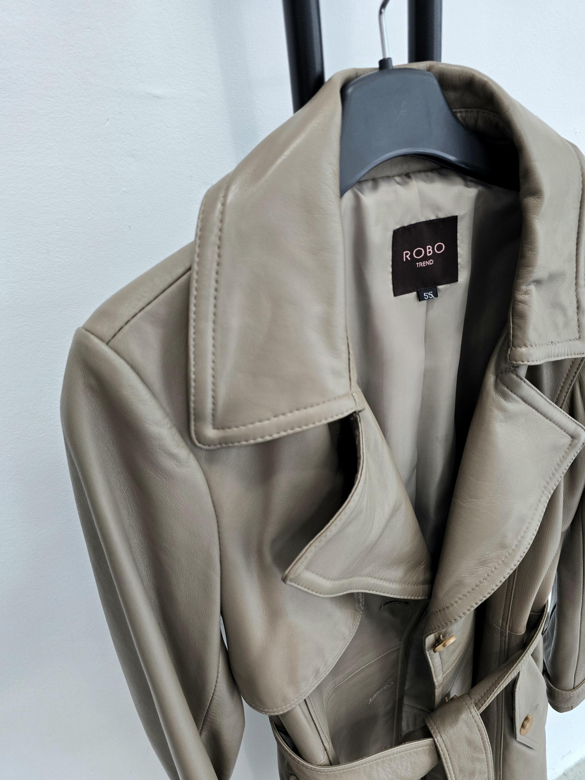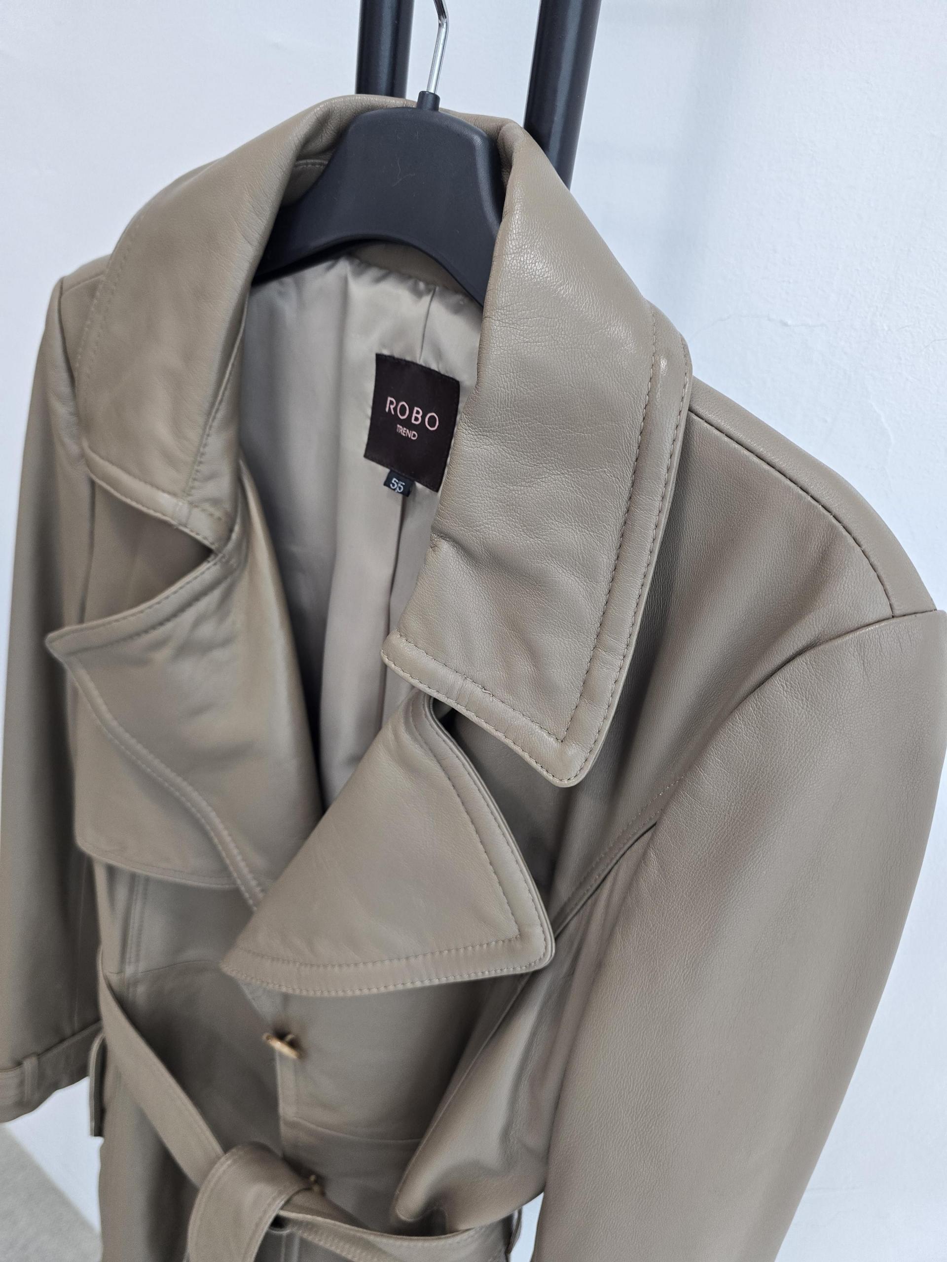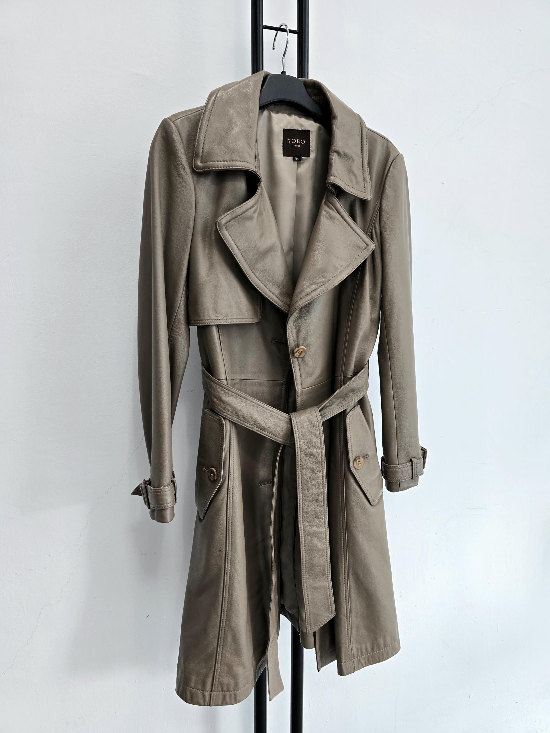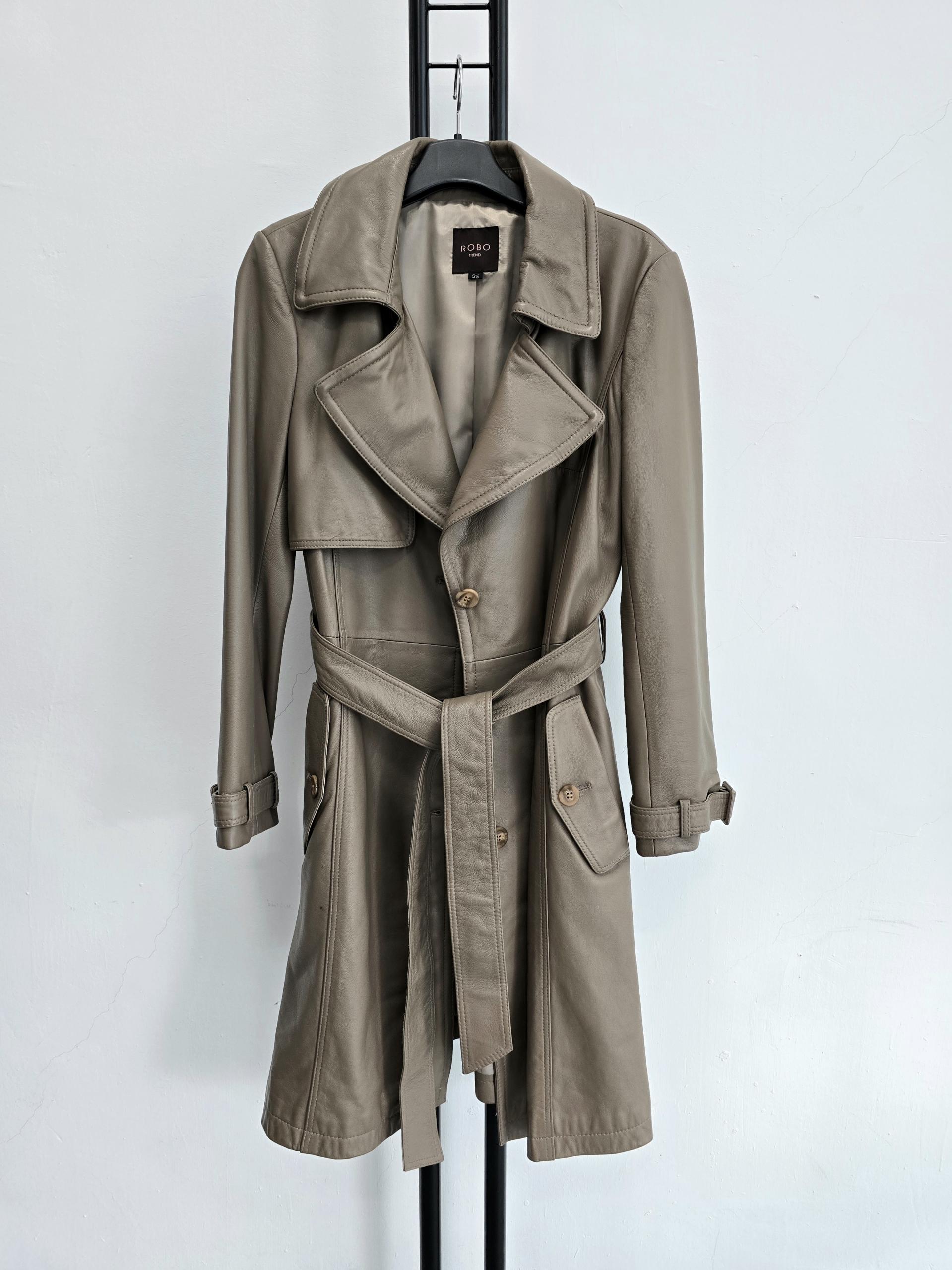 고급스러운 로보 양가죽 트렌치 코트입니다. 은은한 광택이 감도는