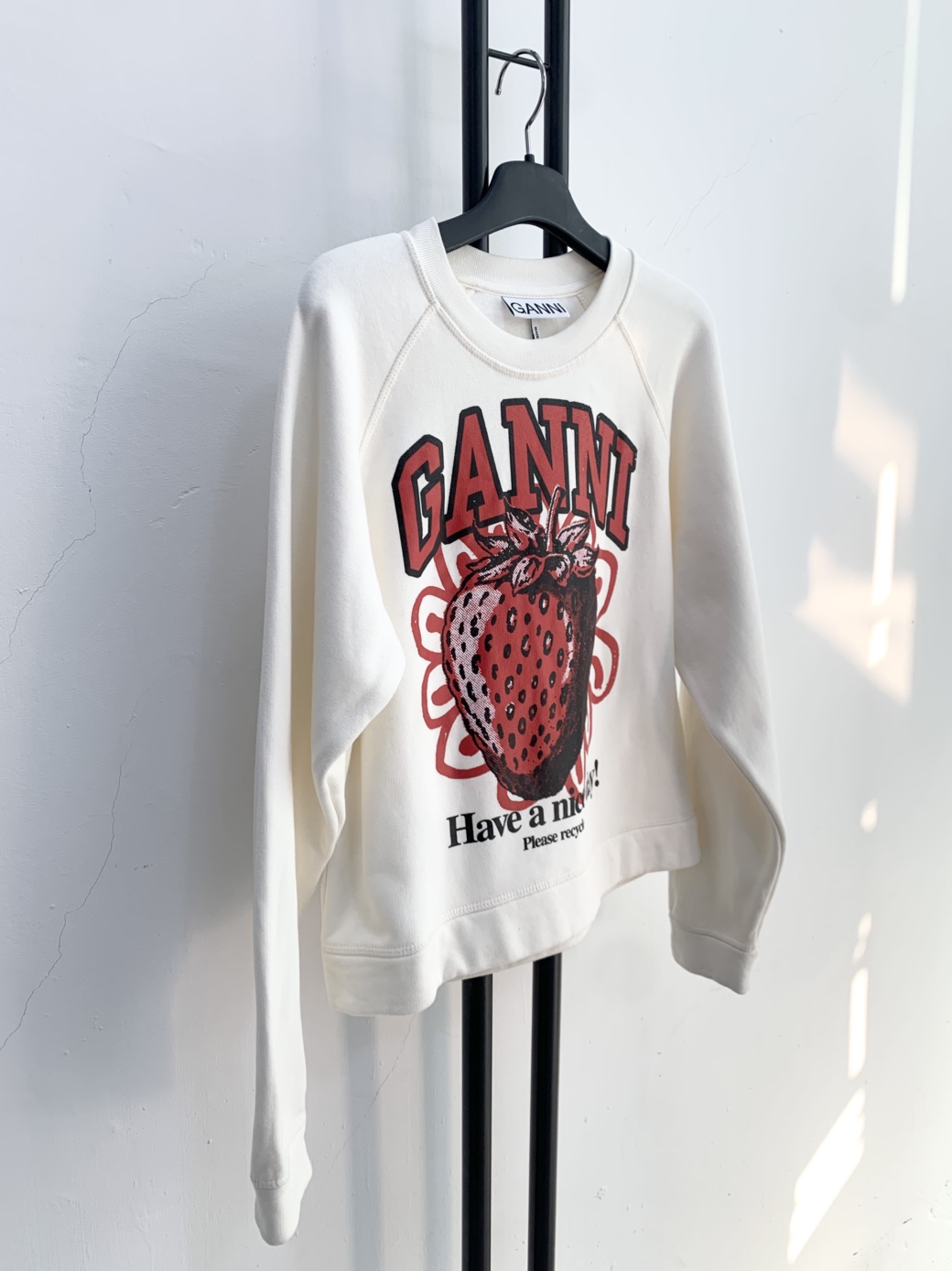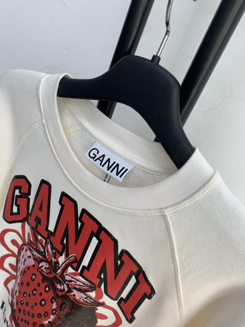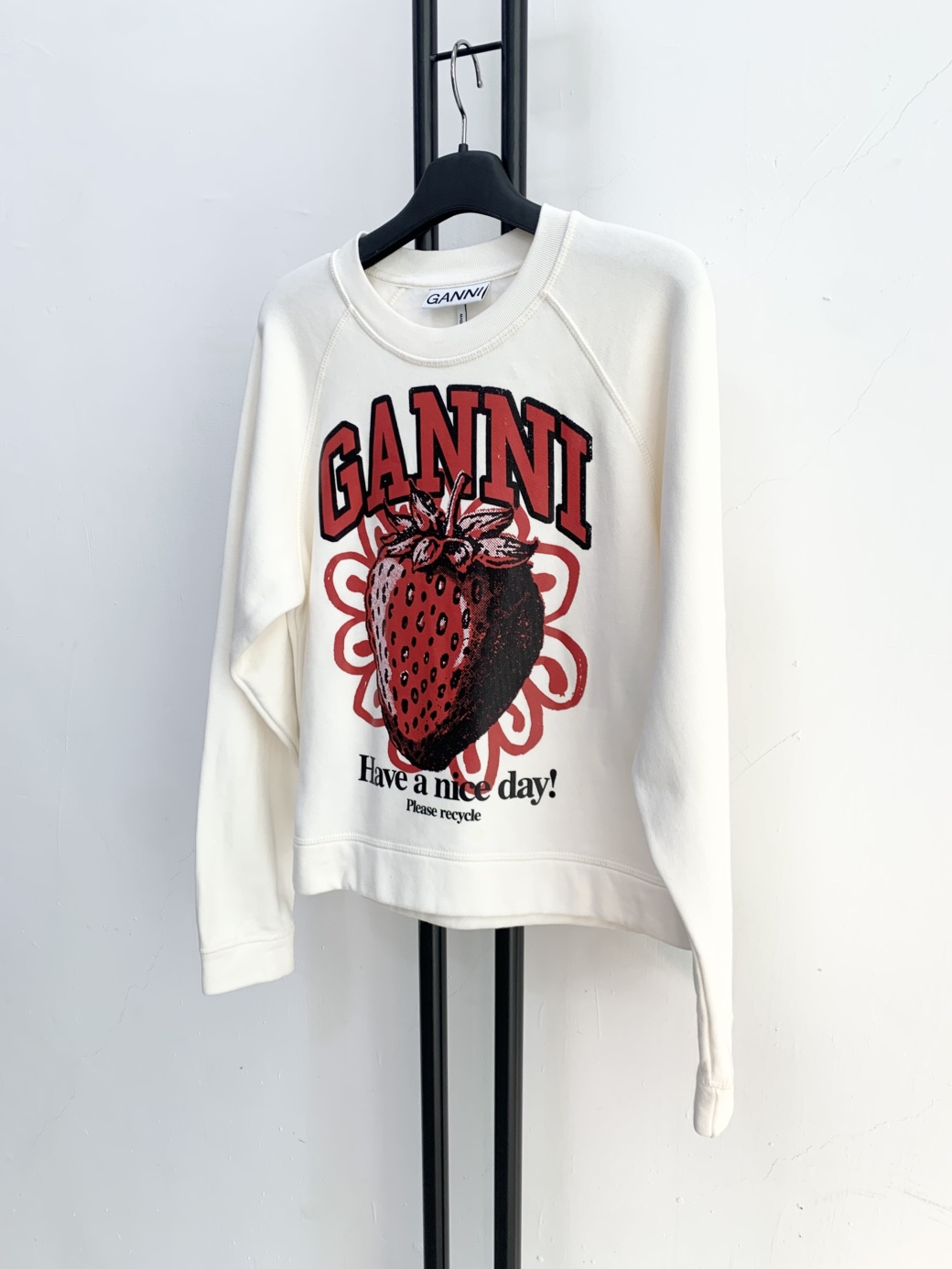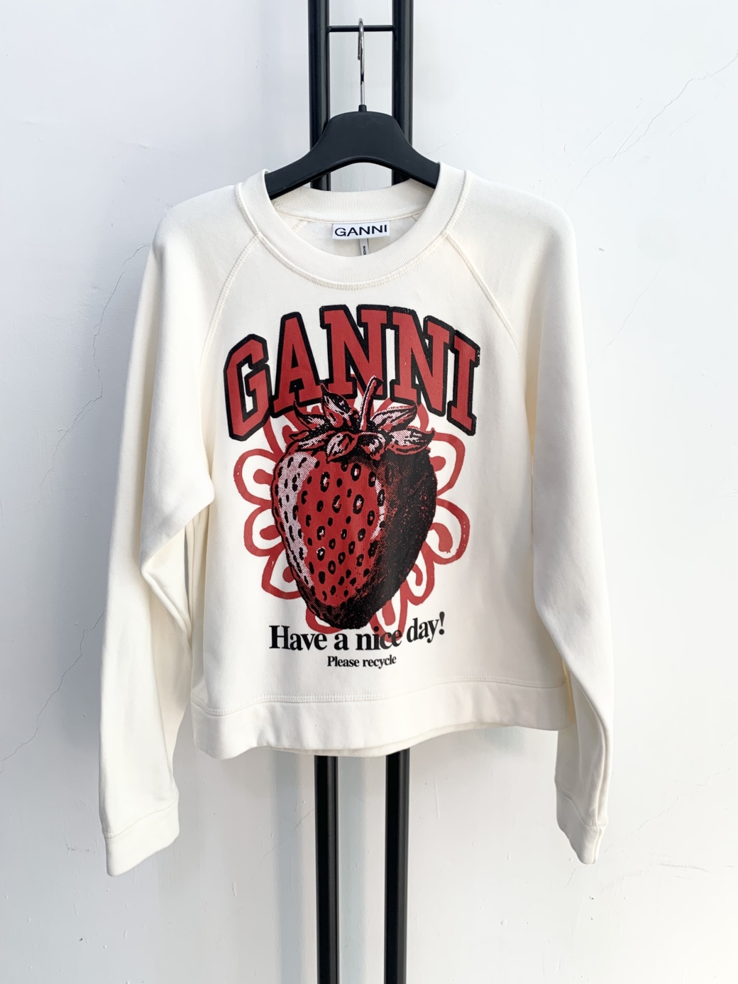 아이보리 색상의 GANNI 맨투맨입니다. 정면에 딸기 프린팅이 포인트로