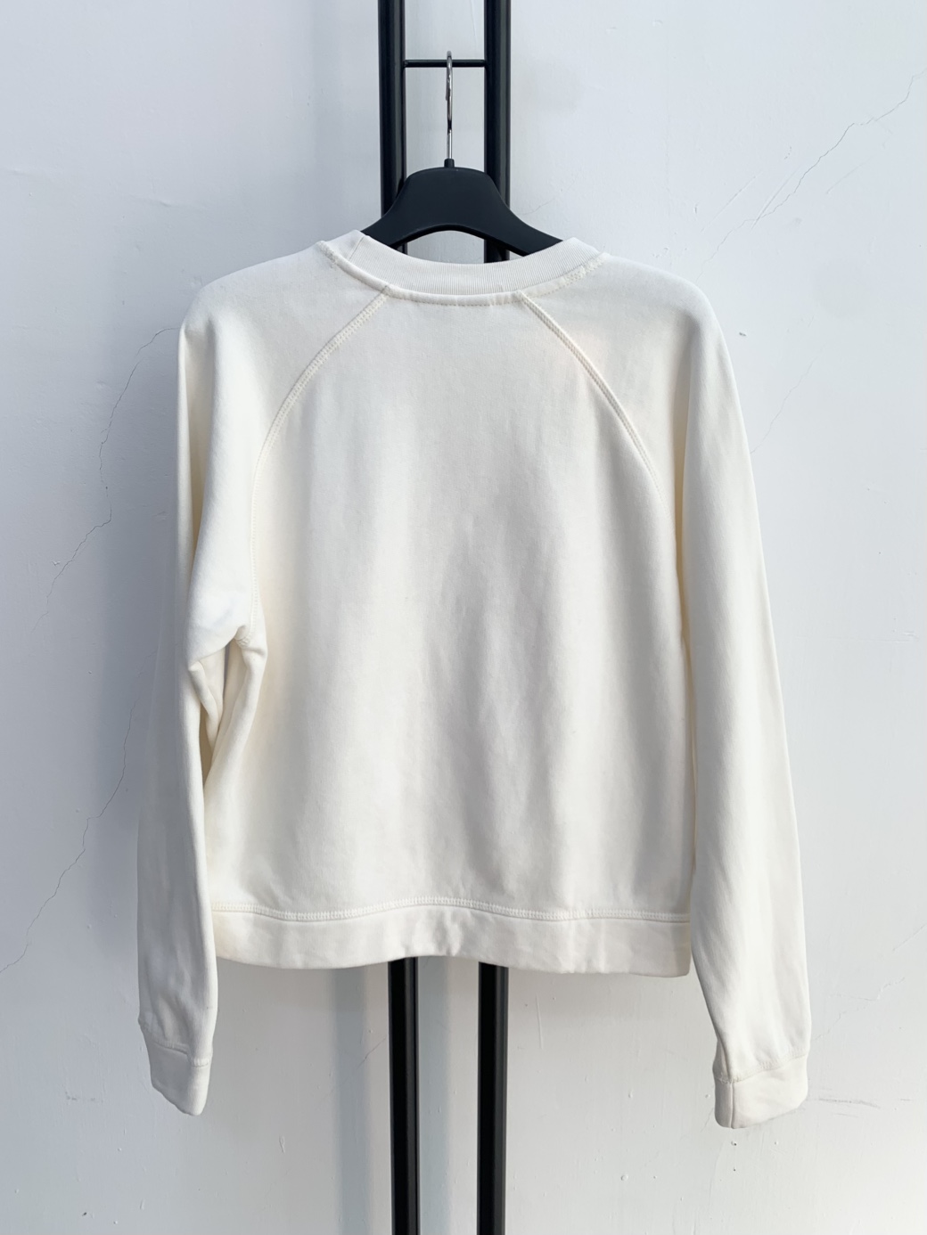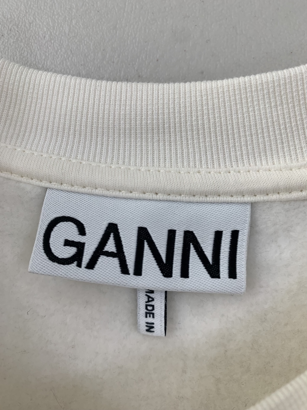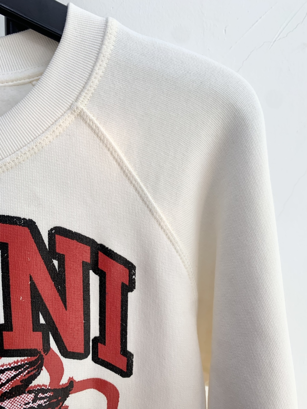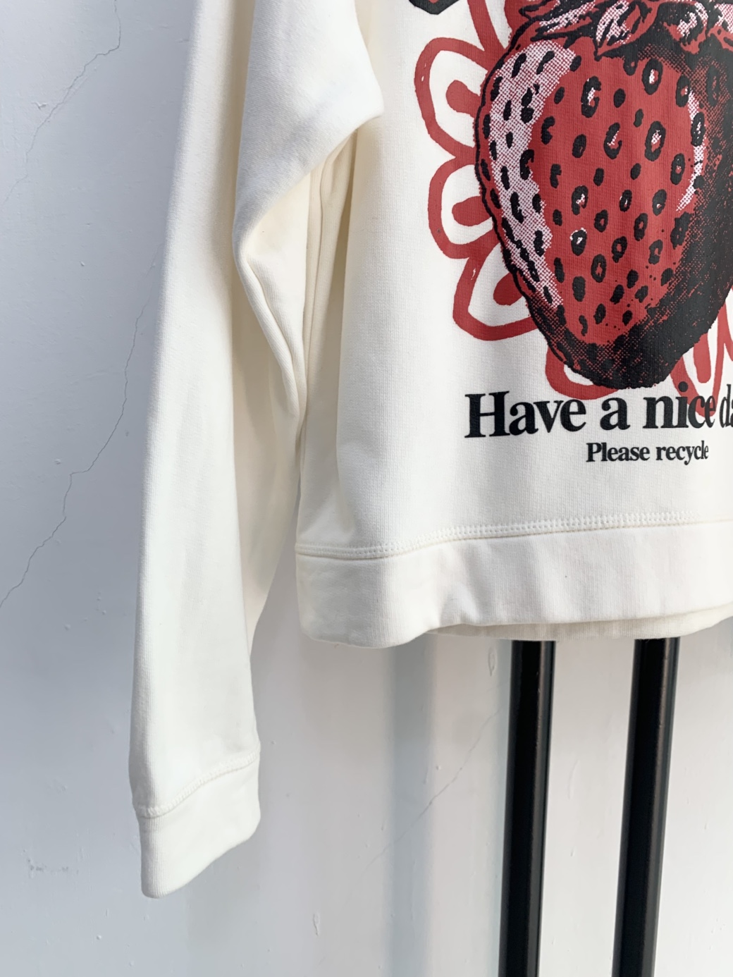 아이보리 색상의 GANNI 맨투맨입니다. 정면에 딸기 프린팅이 포인트로