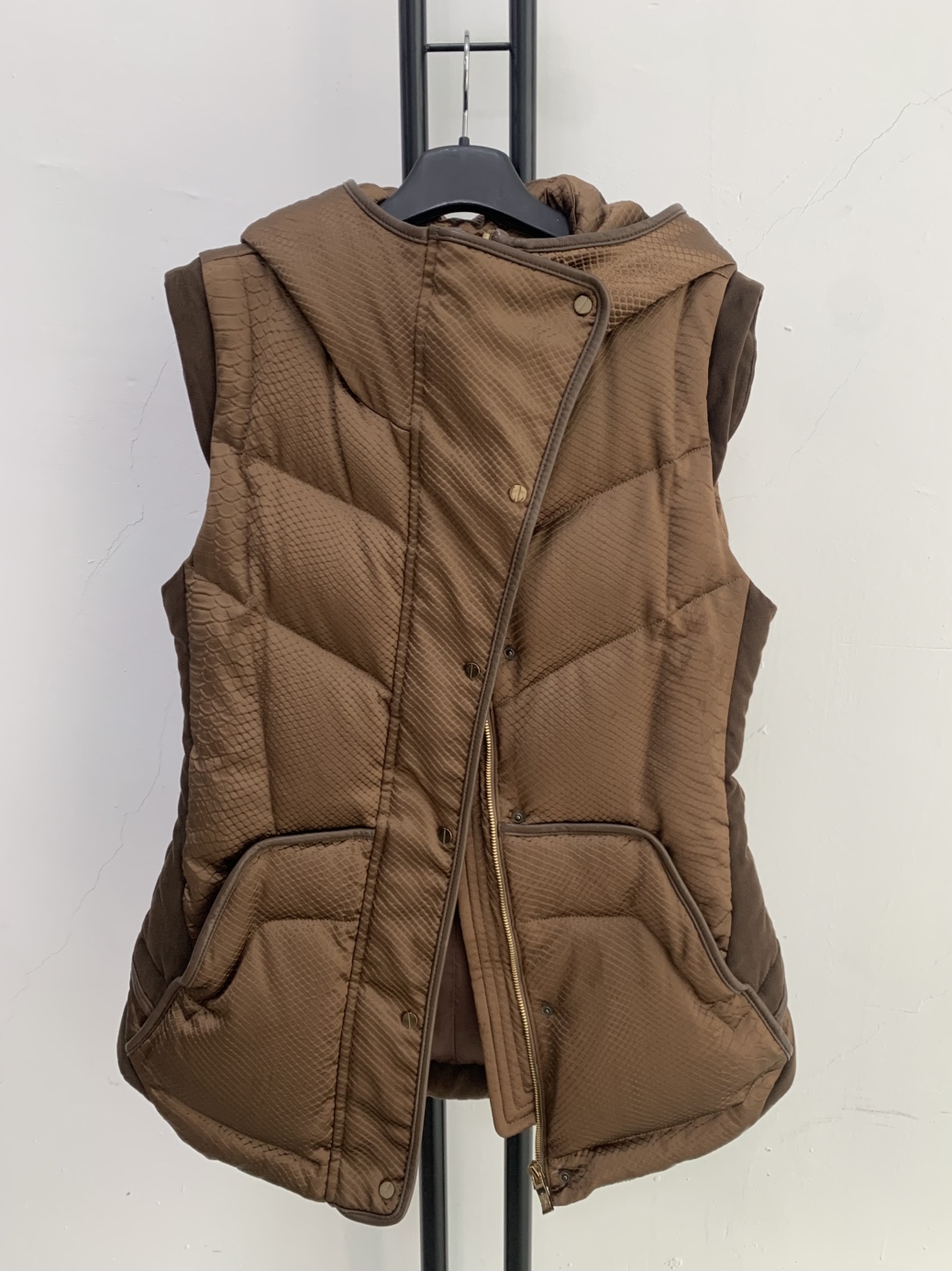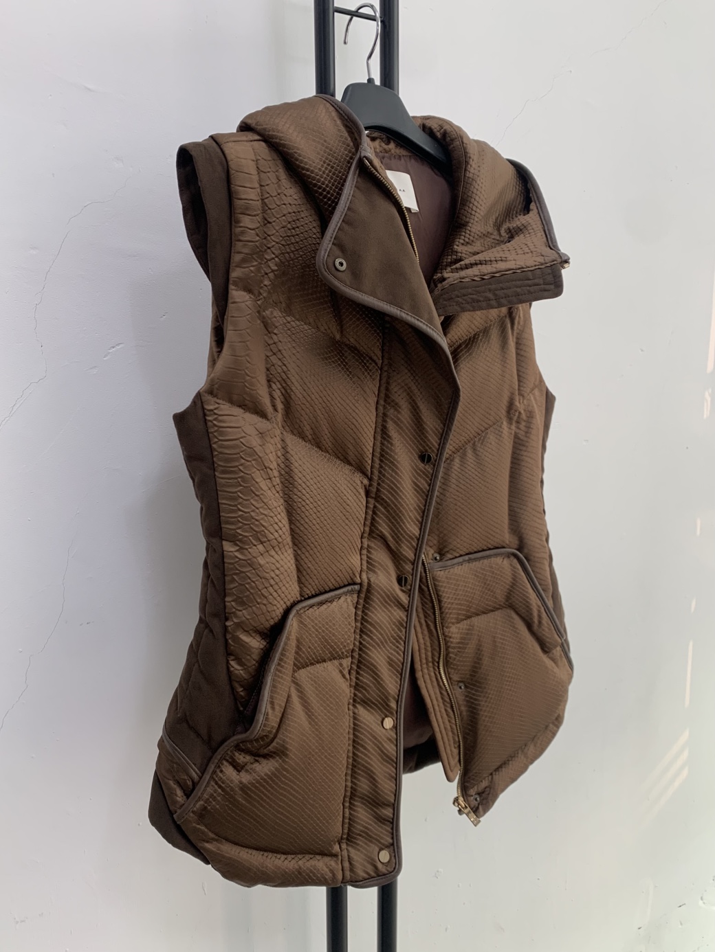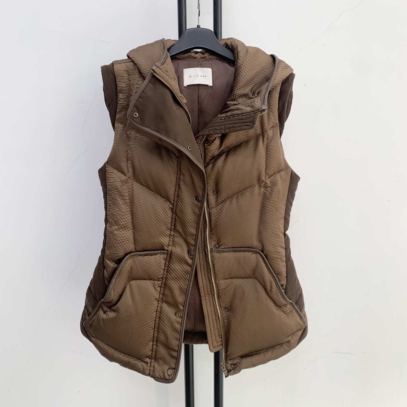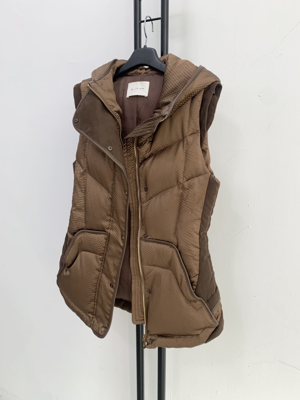 미샤 브라운 퀼팅 패딩 조끼입니다. 독특한 퀼팅 패턴이 눈에 띄는 제품입니다.