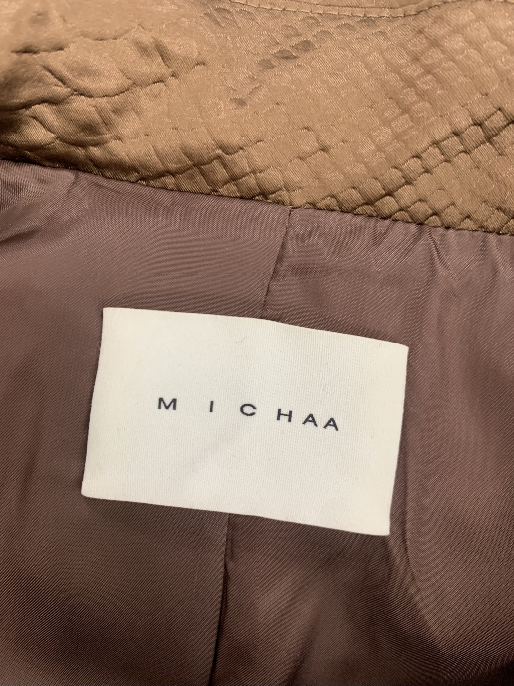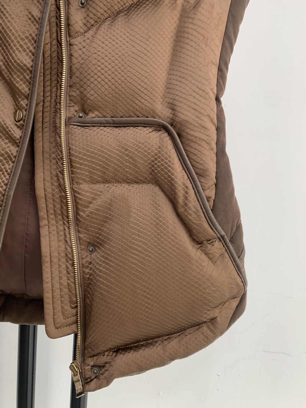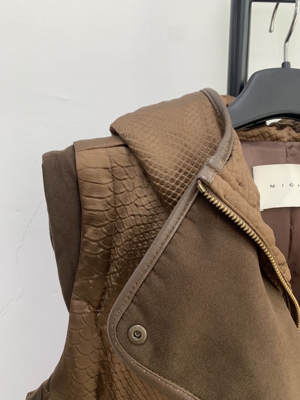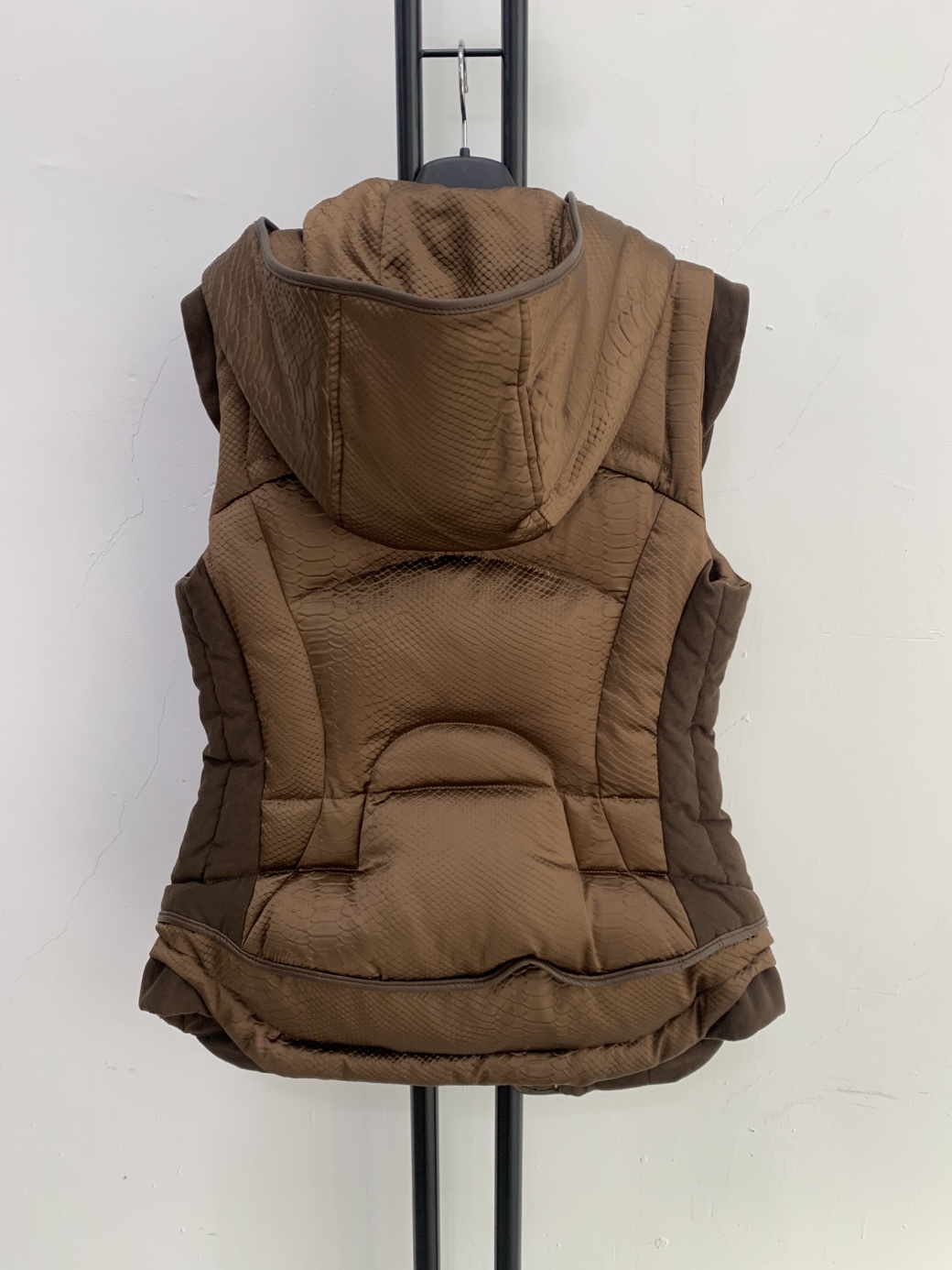 미샤 브라운 퀼팅 패딩 조끼입니다. 독특한 퀼팅 패턴이 눈에 띄는 제품입니다.
