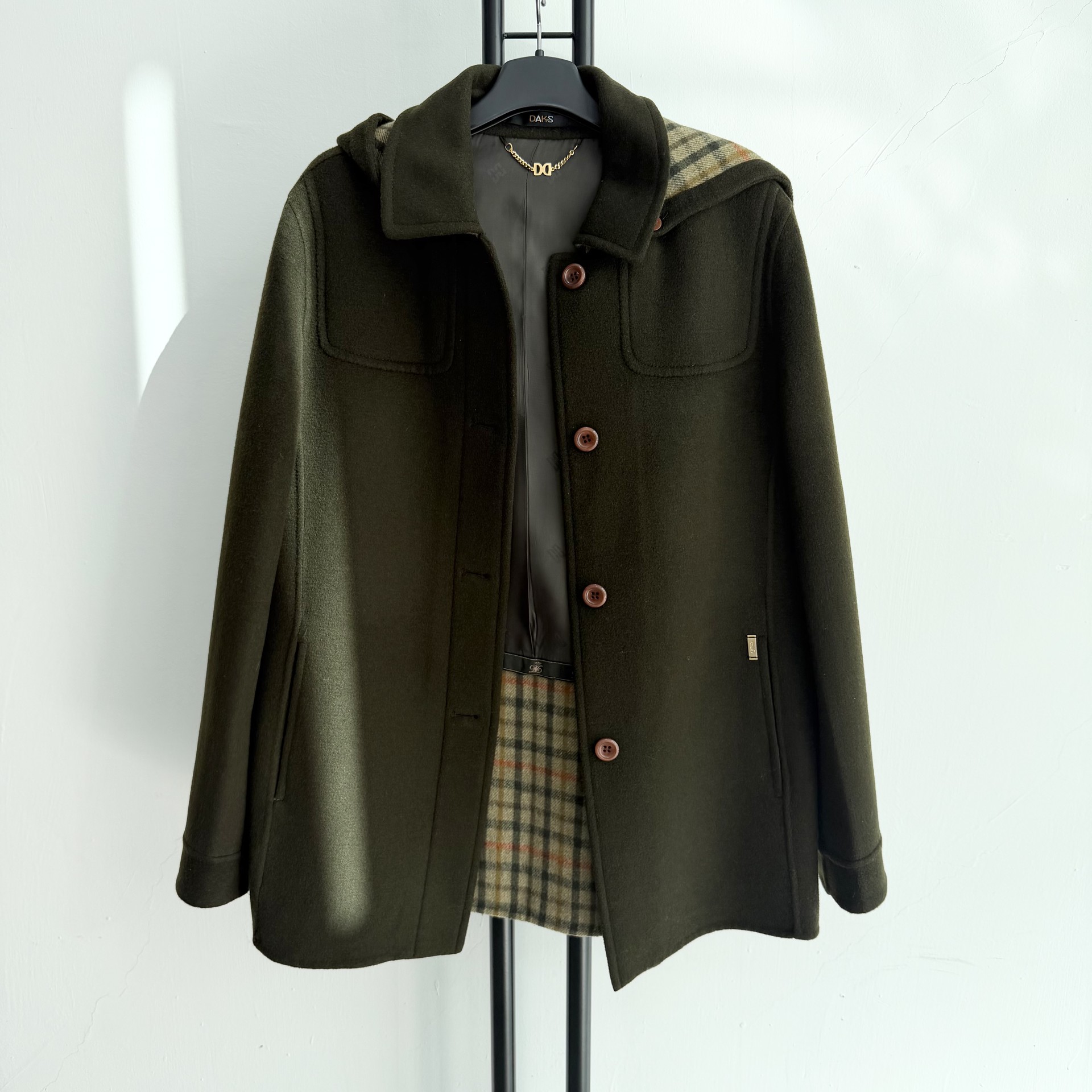 후드 안감과 코트 안쪽 하단에 닥스 시그니처 체크 패턴이 있습니다.