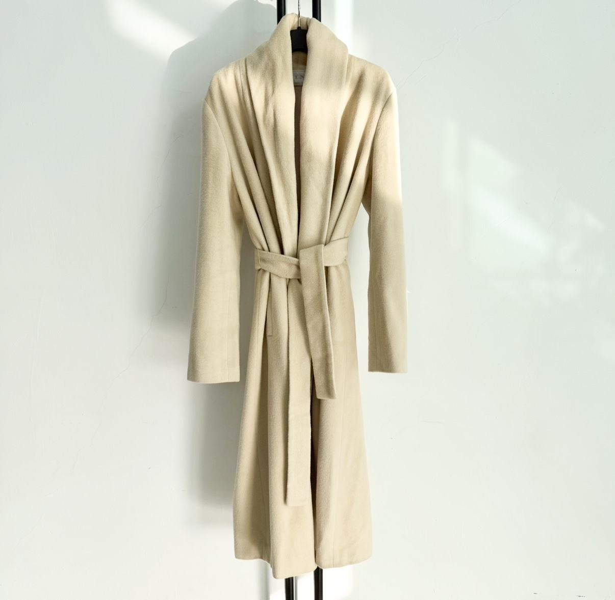 마인 아이보리 벨트 롱 코트입니다.