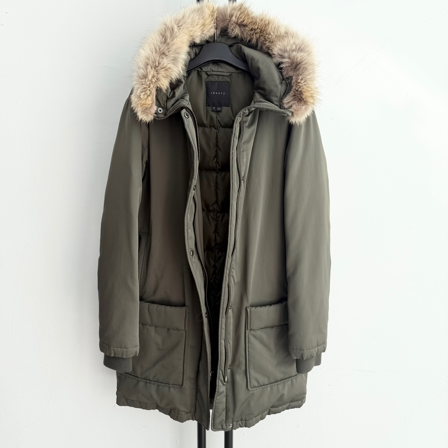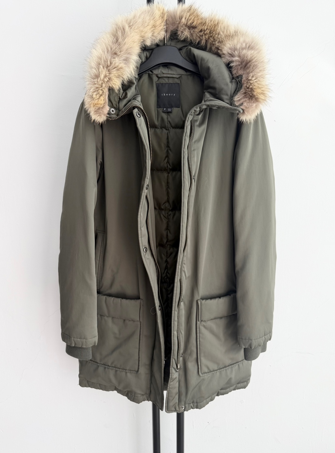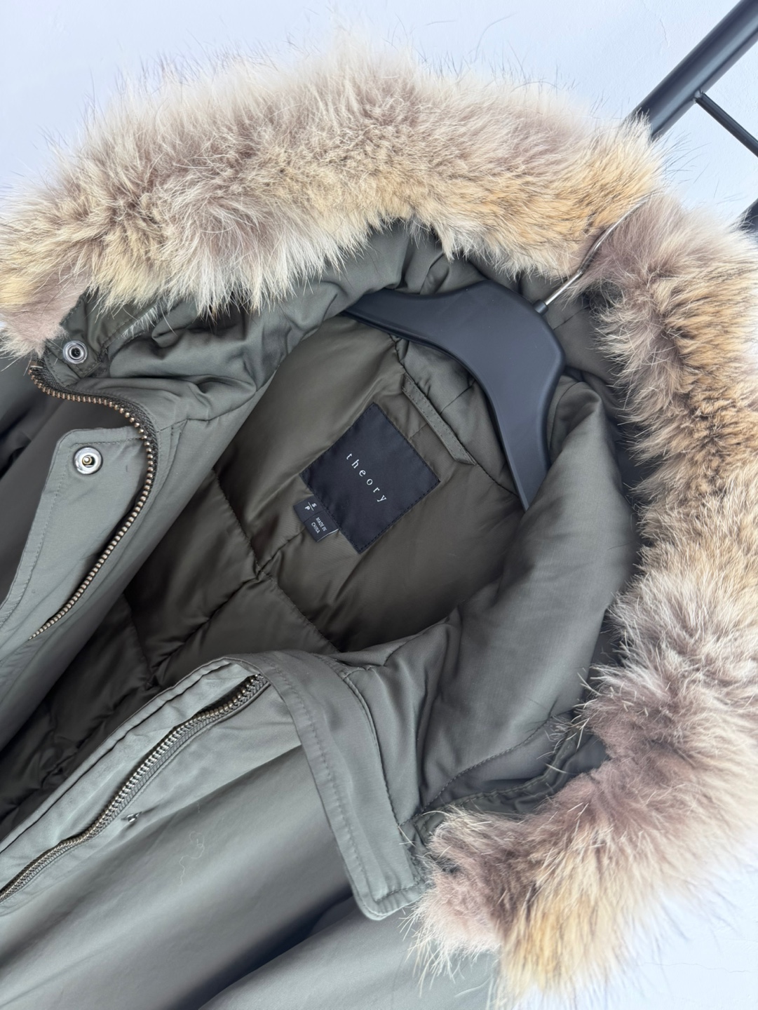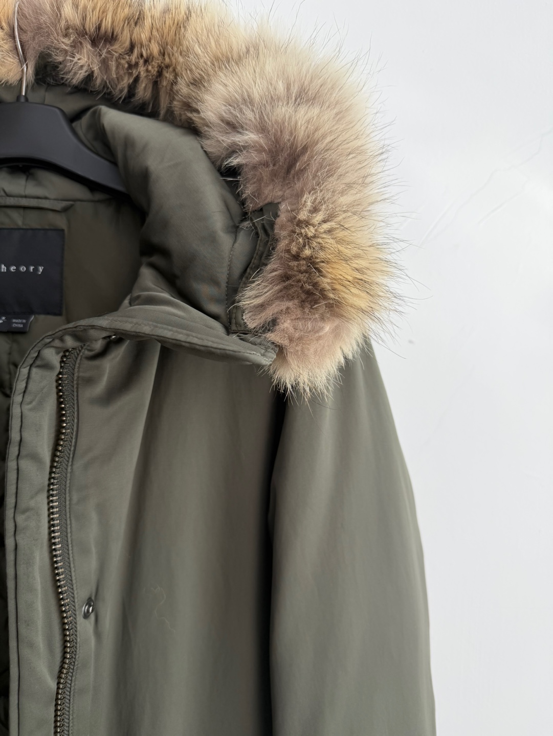 띠어리 카키 코요테 퍼 후드 다운 패딩입니다.
