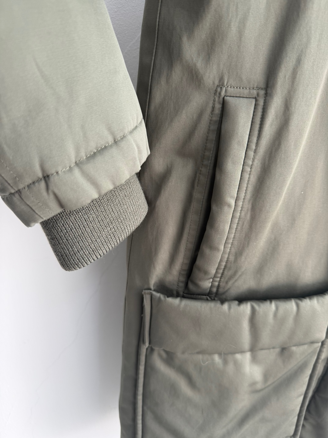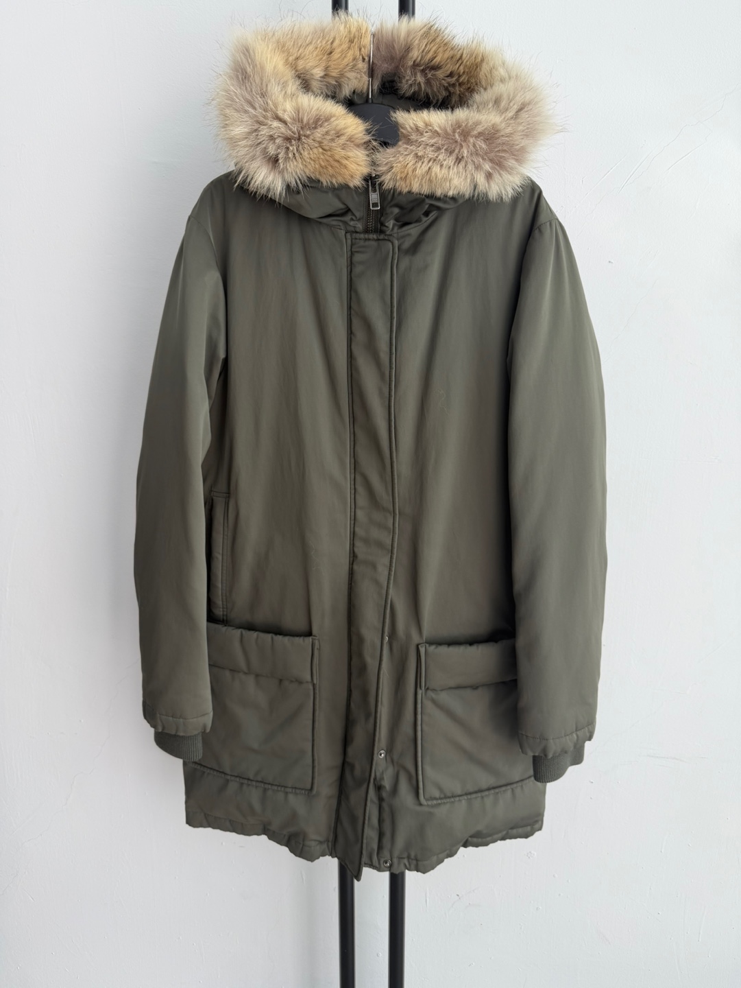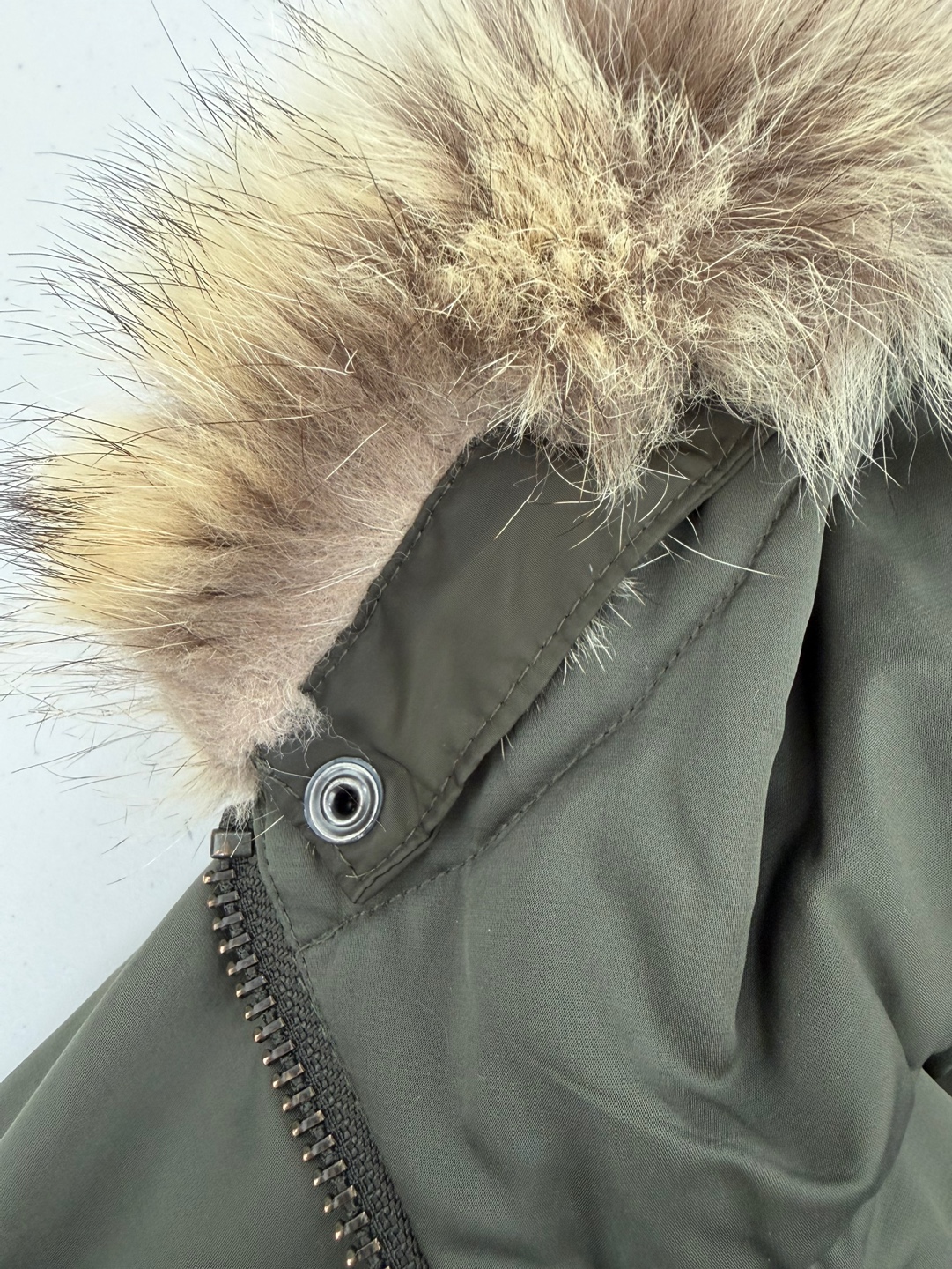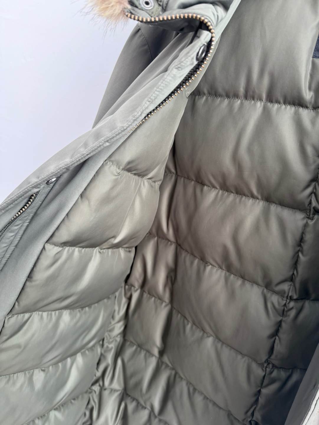 띠어리 카키 코요테 퍼 후드 다운 패딩입니다.