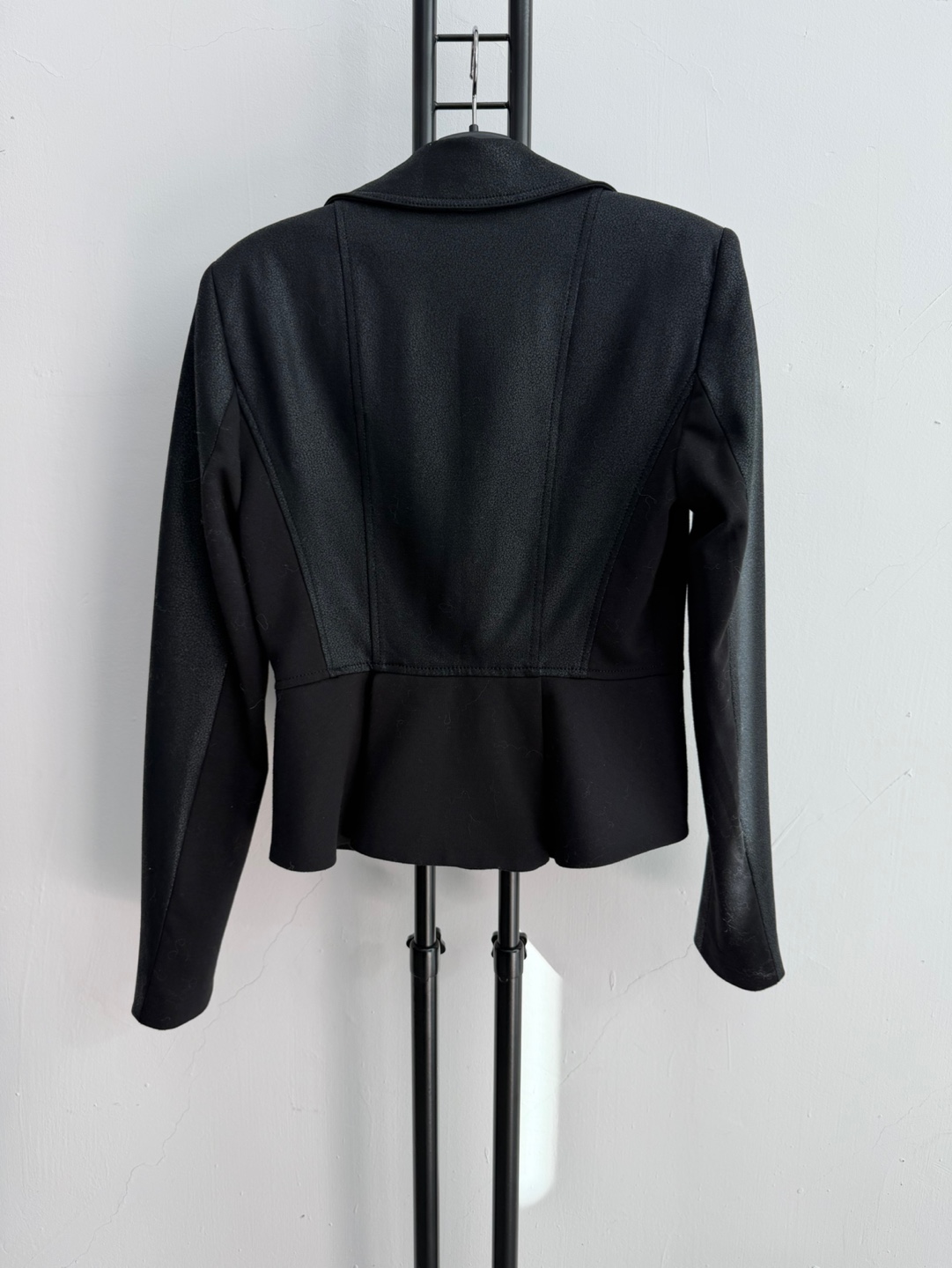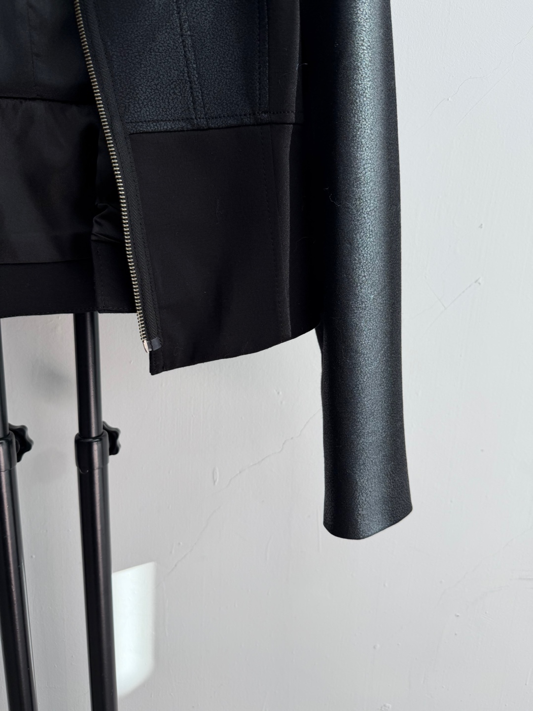 블랙 색상의 가죽 재킷으로, 세련된 디자인이 돋보입니다.