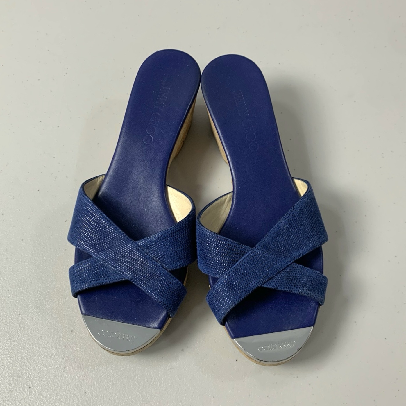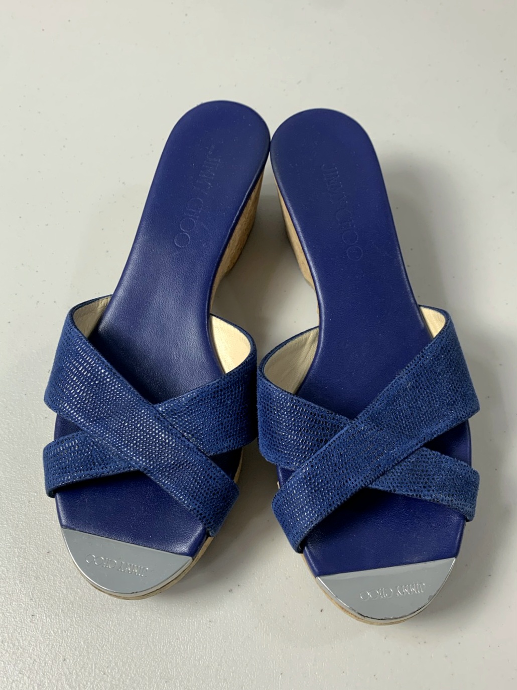 정품 지미추 블루 웨지힐 슬리퍼 샌들입니다.