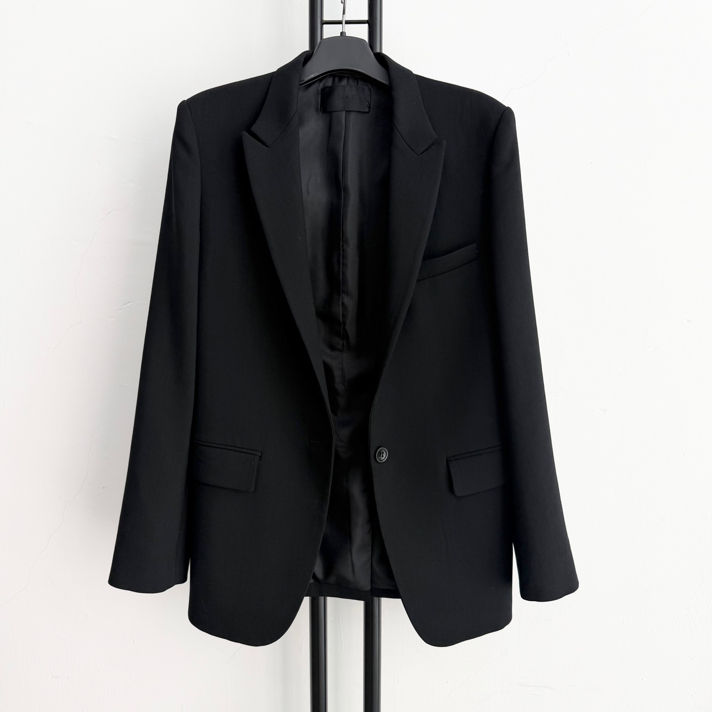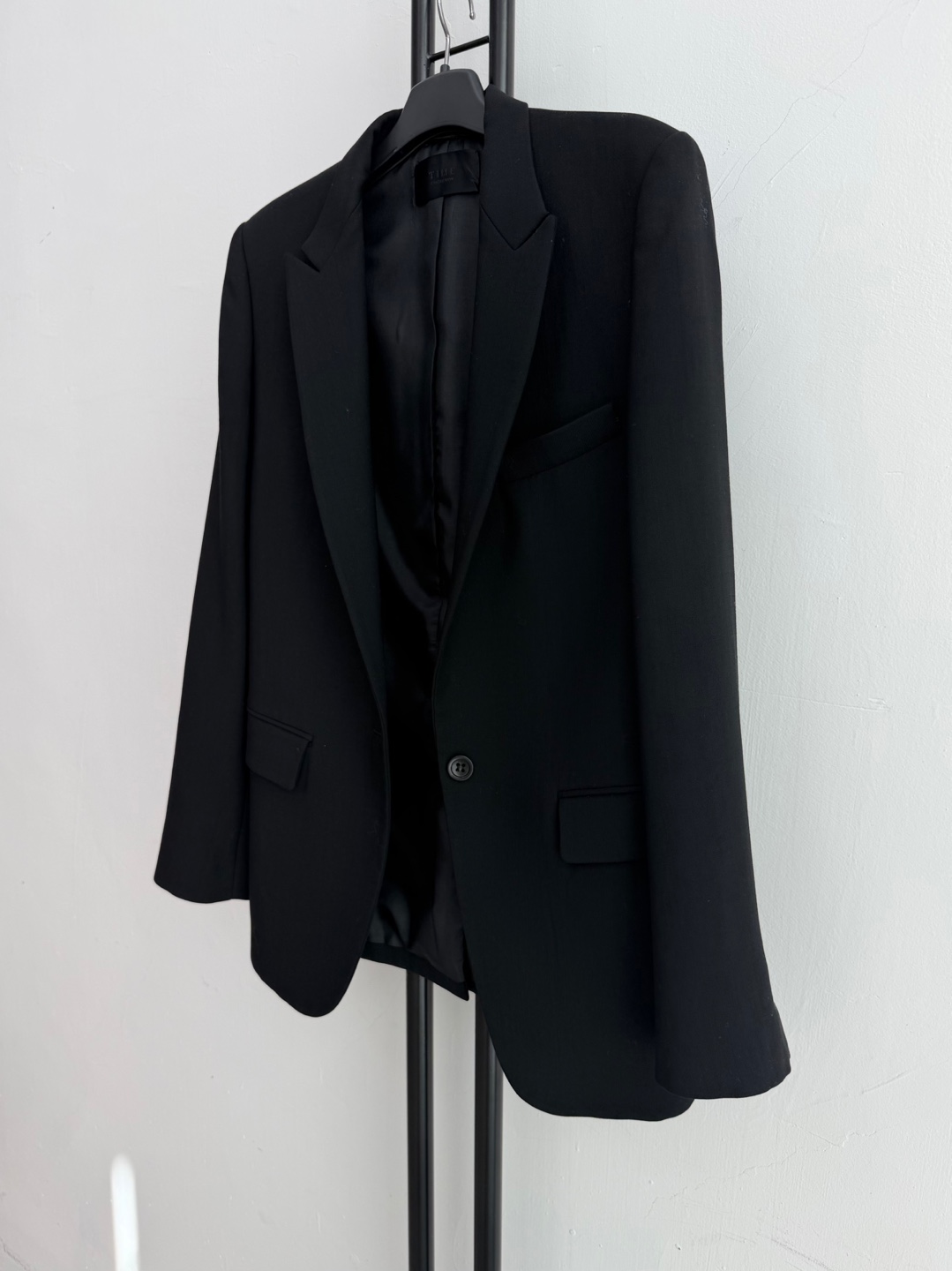 모 소재의 타임 블랙 정장 자켓입니다. 기본핏으로 깔끔하게 떨어지는 디자인입니다.
